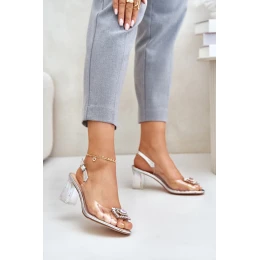 Dámské sandály s průhledným svrškem. Umístěny na podpatku ve tvaru sloupu. Na přední straně brož, která dodává eleganci. Měkká vložka je vyrobena z přírodní kůže. Ideální na různé slavnosti. Při výběru velikosti se řiďte tabulkou velikostí.