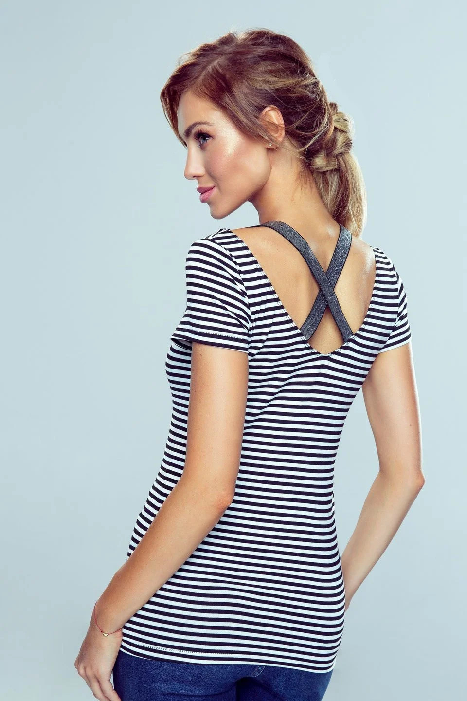 Stylová halenka zdobená stříbrnými elastickými pásky v podobě ozdobných lesklých ramínek. Skvěle se hodí k džínám, inspirovaným stylem Glam. Měkká, pružná bavlna v jemném bílo-černém proužku. Složení: 95% bavlna, 5% elastan.