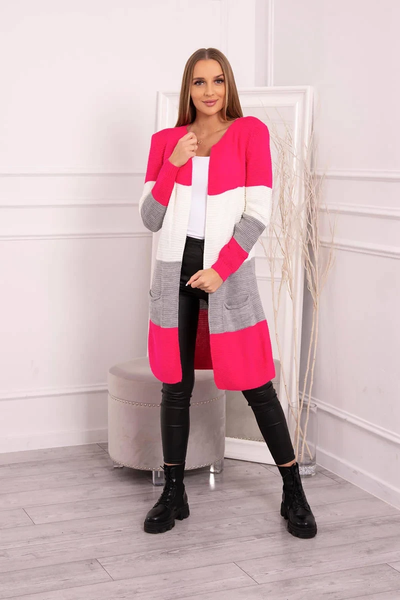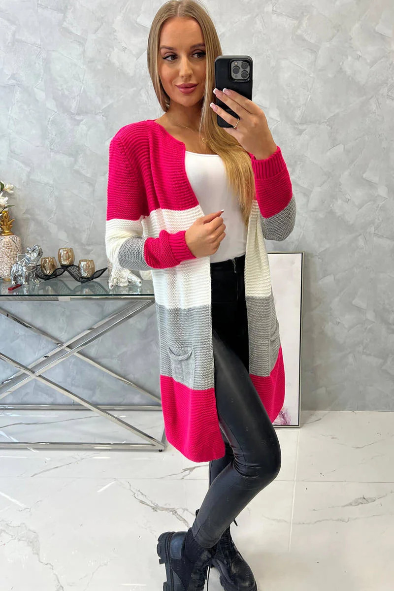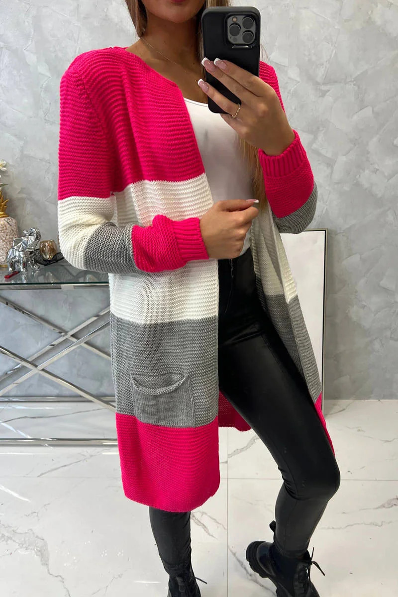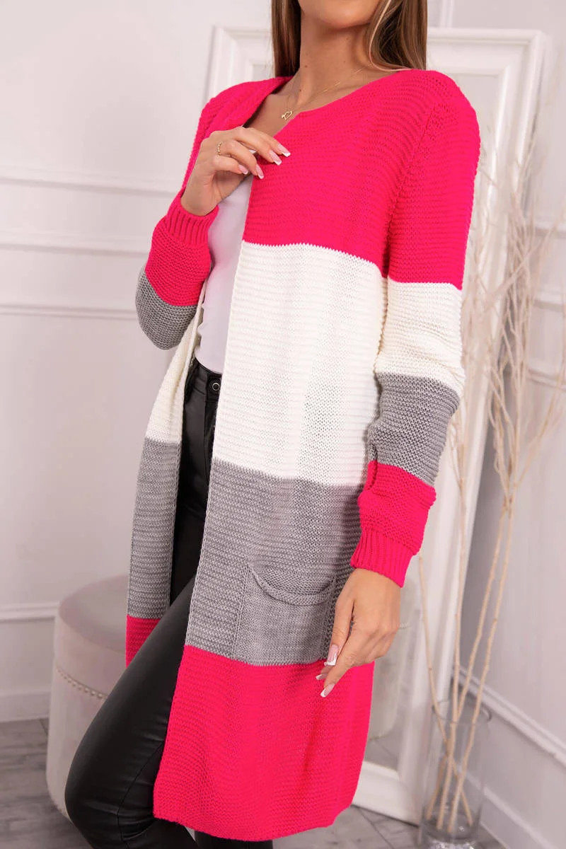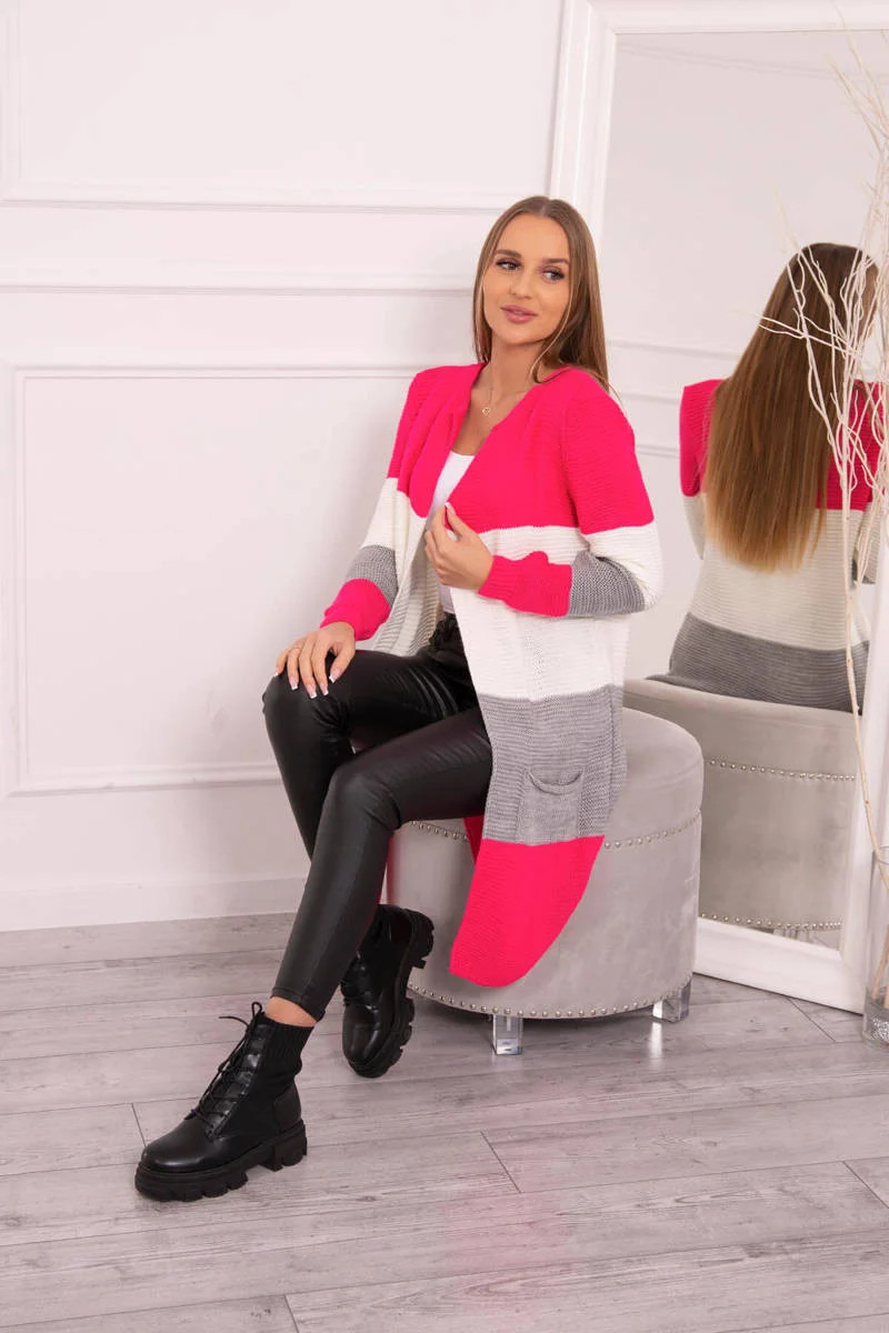 Představujeme vám dlouhý svetr se širokými pruhy. Svetr s dlouhým rukávem a rozepínáním. Na přední straně má dvě praktické kapsy. Velmi módní kombinace barev. Ideální pro jakýkoli styl. Svetr je vyroben z vysoce kvalitního materiálu. Velikost je univerzální a vyhovuje dámám ve velikostech M, L, XL