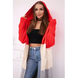 Pruhovaný svetr s kapucí červená + béžová + šedá