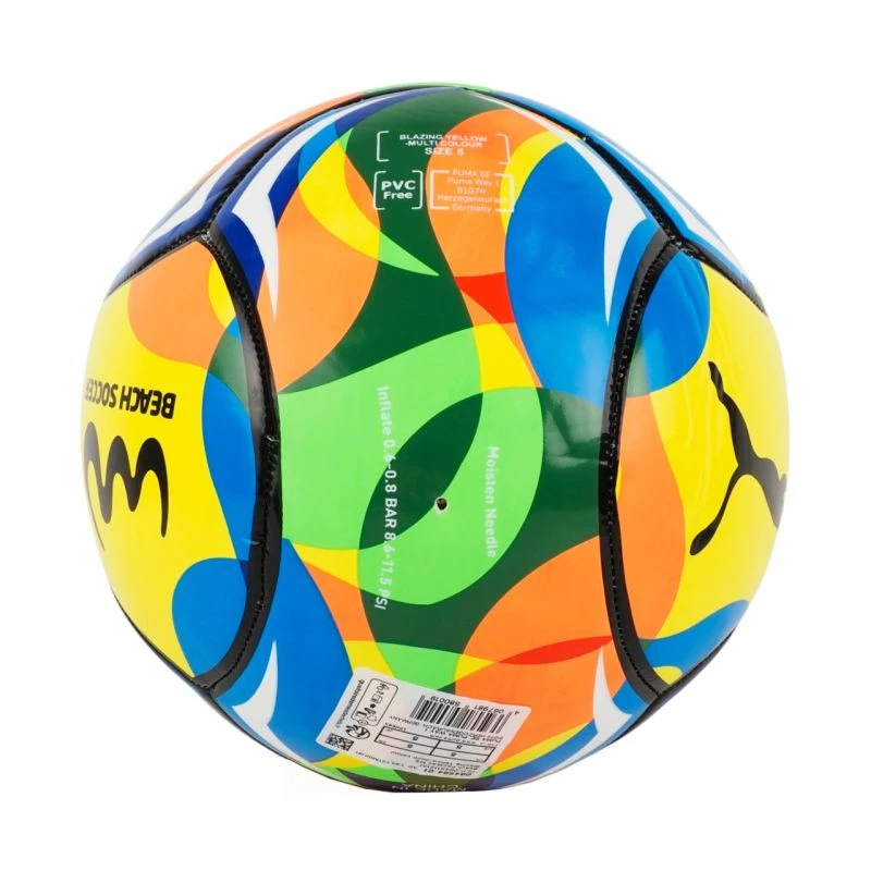 Míč na plážový fotbal Puma MS Blazing yellow 84584 01 pro trénink a amatérské plážové hry. Model inspirovaný oficiálním míčem NEOM Beach Soccer Cup 2024. Konstrukce kombinující 6 panelů spojených strojovým šitím. Vnější plášť z TPU s pěnovou výstelkou. Zesílený gumový měchýř.