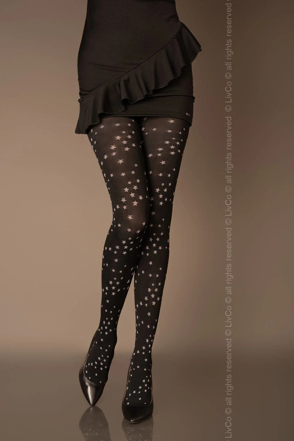 Novinka! Stylové punčocháče pro zimní styling - černé s malými, světlými, roztomilými hvězdičkami. Tloušťka 80 DEN vás udrží v teple a pohodlí. Hvězdičky vypadají krásně a okouzlujícím způsobem zdobí nohy. Dokonale nahradí vaše známé hráškové nebo květinové dekorace. Složení: 86 % polyamid, 14 % elastan. EAN čárové kódy zboží jsou:
