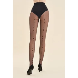 Elegantní punčochové kalhoty Amori 20 denier jsou nabídkou pro ženy, které chtějí decentně, ale účinně zdůraznit svou ženskost. Černé, klasické punčochové kalhoty na přední straně a smyslný, ozdobný šev na zadní straně vytvářejí harmonický celek. Vzor v podobě srdíček prokládaných drobnými tečkami přitahuje pozornost, opticky zeštíhluje siluetu a dodává romantické kouzlo každému stylingu.
