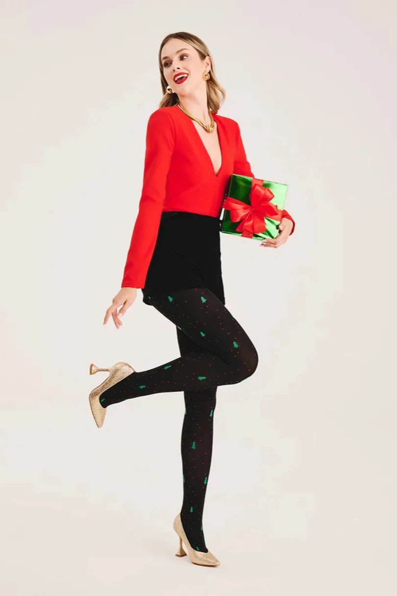 Černé vánoční punčocháče se vzorem zelených vánočních stromečků a drobných červených teček jsou skvělým nápadem na dárek pro někoho výjimečného nebo pro sebe pod vánoční stromeček! Punčocháče o síle 60 denierů jsou vyrobeny 3D technologií, díky které jsou odolné, hřejivé a na noze stylové. Vánoční punčocháče přilnou k tělu, nevyčnívají pod oblečením a absence samostatné kalhotkové části zvyšuje komfort nošení, neomezuje v pohybu.