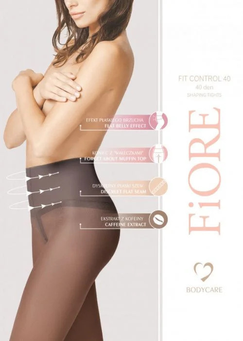 Inovativní punčochové kalhoty Fit Control značky Fiore, které pomáhají dosáhnout plochého bříška a zeštíhlujícího efektu na bocích těla. Hladké, ideální pro každodenní styling. Měkká, vysoce kvalitní příze s aplikovaným kofeinovým extraktem, který udržuje pokožku suchou a eliminuje nepříjemné pachy. Tloušťka 40 DEN. Složení: 79 % polyamid, 19 % elastan, 2 % bavlna.