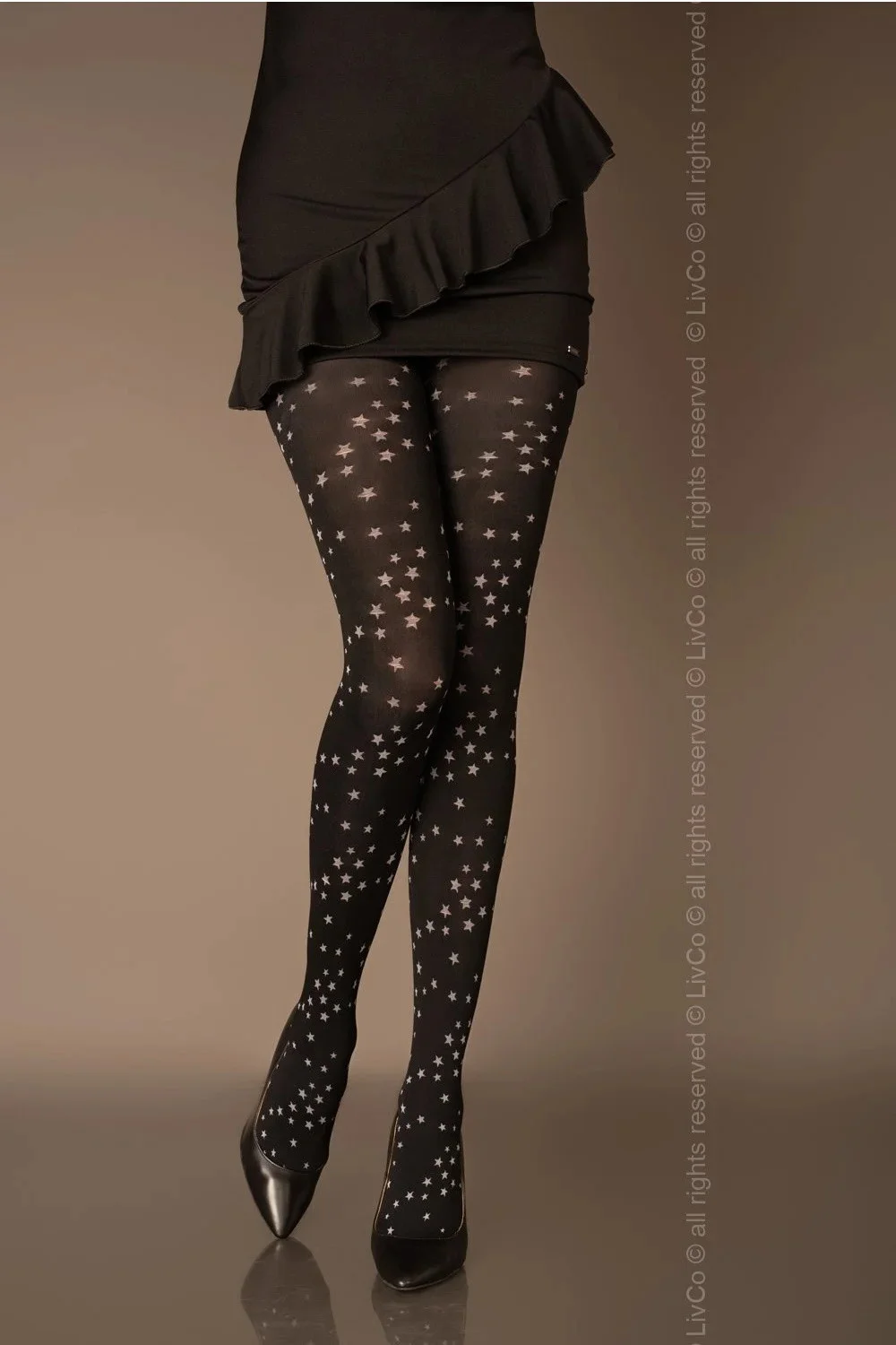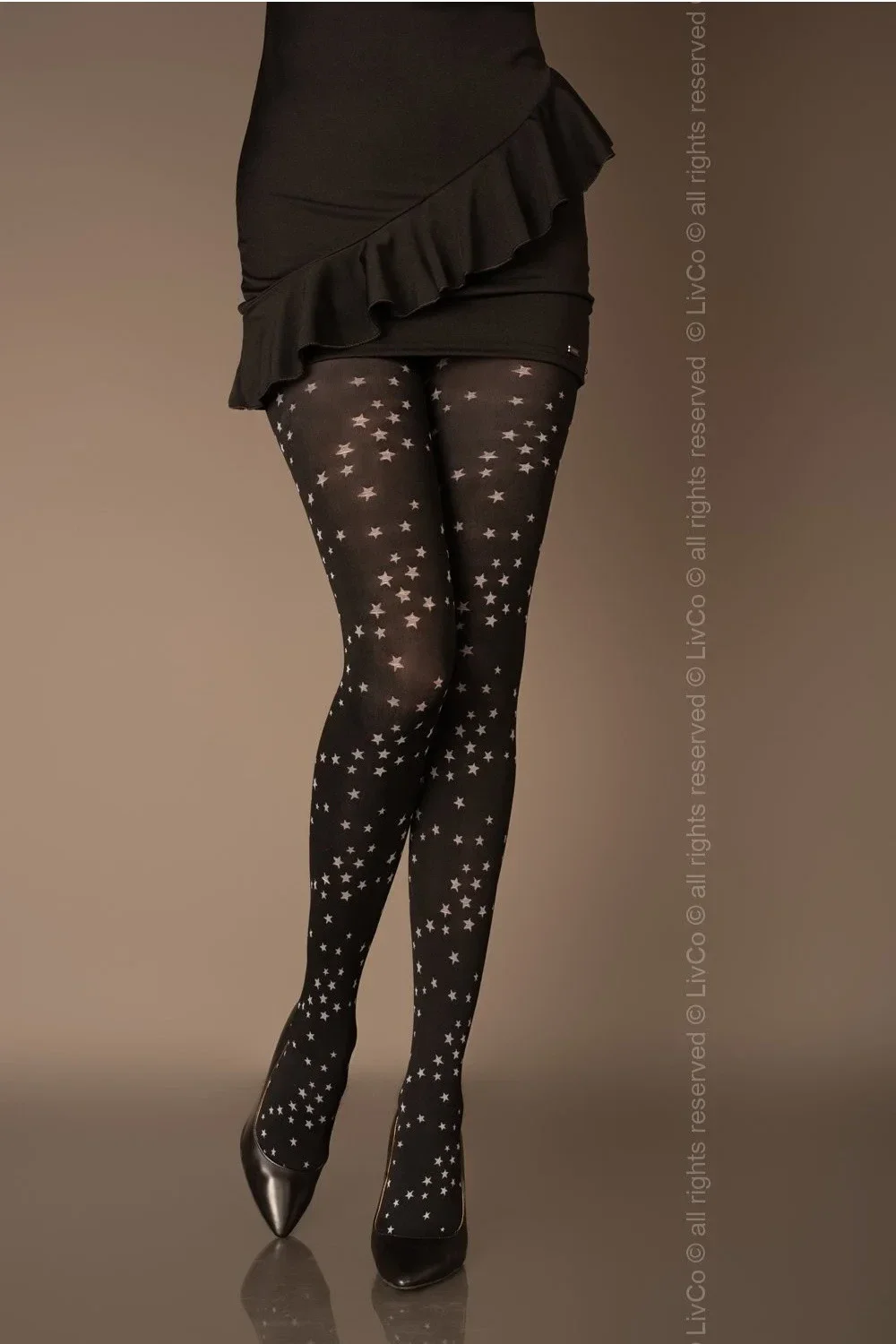 Novinka! Stylové punčocháče pro zimní styling, černé, s malými, světlými, okouzlujícími hvězdičkami. Tloušťka 80 DEN vám poskytne teplo a pohodlí. Hvězdičky vypadají krásně a okouzlujícím způsobem zdobí vaše nohy. Jsou dokonalou náhradou za známé puntíky nebo květinové dekorace.