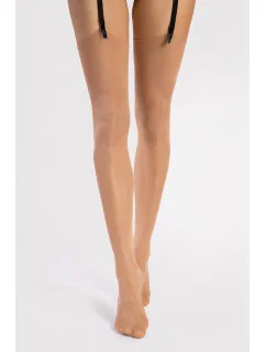 Průsvitné punčochy s přídavkem vlákna Lycra. Podšité jsou dvojtým silikonovým páskem. Neviditelně zesílené prsty. Zdobené květovanou krajkou.