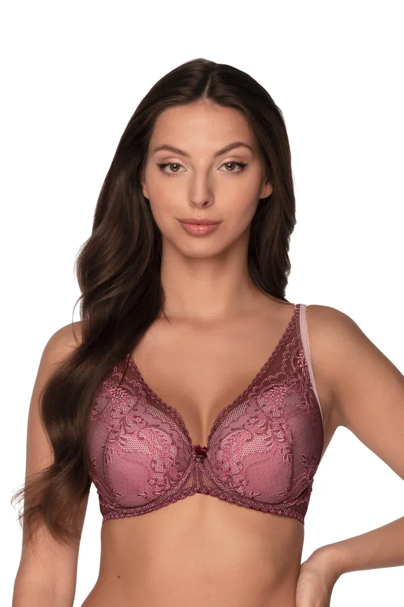 Push-up podprsenka, košíčky v jemné rós barvě pokryté vínovou krajkou prodlouženou vysoko na ramínku, která dodává IRENE sexy charakter. Vyjímatelná Push-Up vložka, konstrukce zvedá a zvýrazňuje poprsí, spodní část košíčku je vyrobena z pěny, kteráóra chrání prsa a poskytuje jim velmi dobrou oporu.