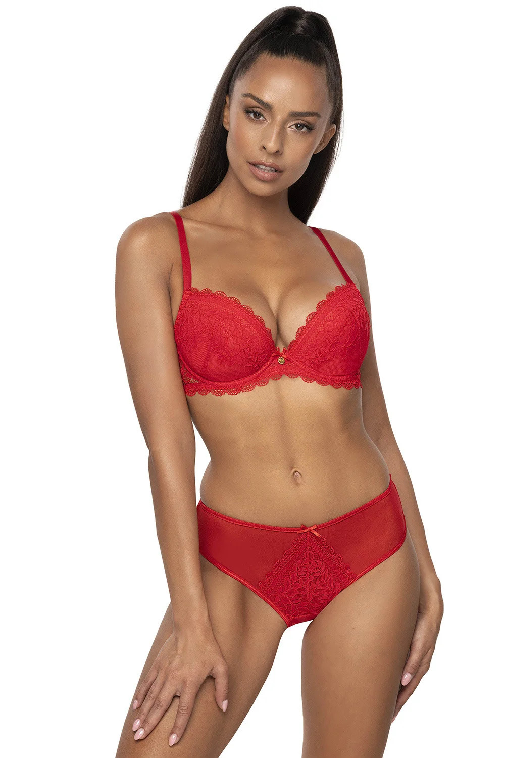 Podprsenka od Mat. Model 0198/11/2 Estelle. Má drátky, které prsa správně tvarují. Výrobek má nastavitelná ramínka bez možnosti jejich odepnutí. Háčky na ramínka jsou vyrobeny z kovu. Podprsenka se zapíná na háčky. Místo zapínání: na zádech. Dvě řady svislých háčků. Tři řady vodorovných háčků.