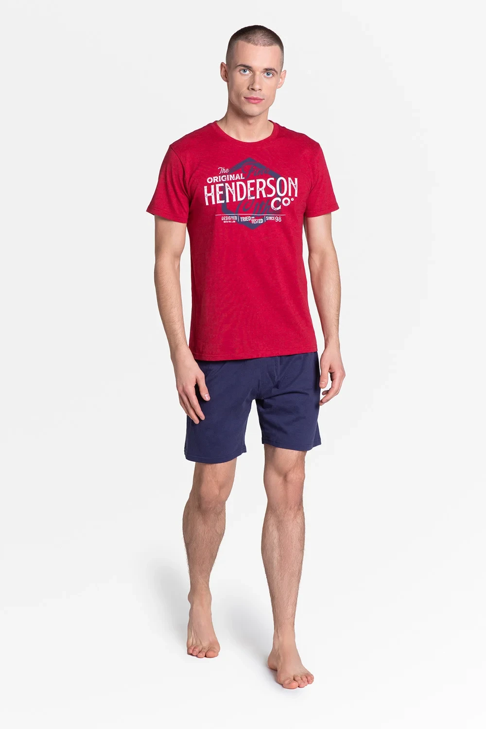 Lars je dvoudílný pyžamový komplet v červené a tmavě modré barvě s šortkami pod kolena z nadčasové řady Core značky Henderson. Najdete zde měkké, na dotek příjemné látky, pohodlné střihy a potisky, které dodávají vzorům charakter.