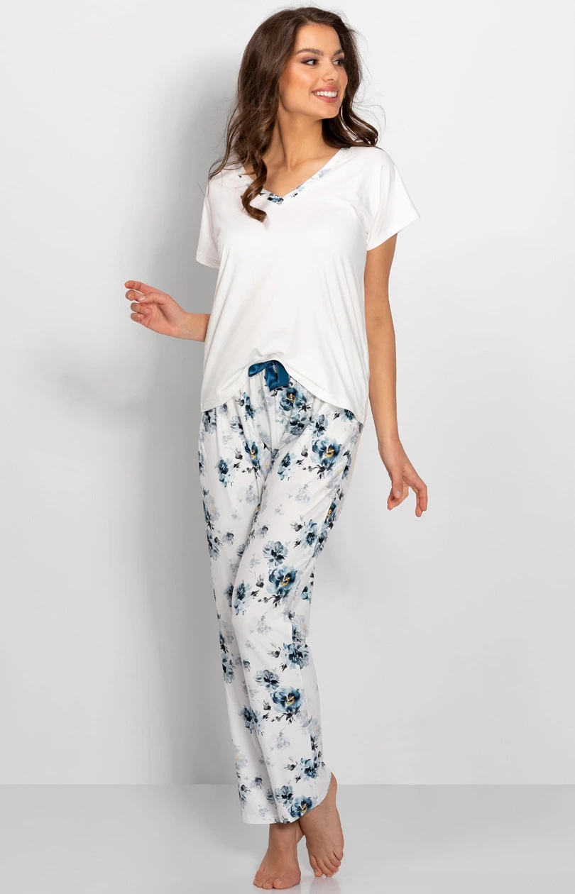 Dámské pyžamo sestávající z halenky a kalhot. Halenka s krátkými rukávy a špičatým výstřihem. Dlouhé kalhoty bez kapes s ozdobnou mašlí v pase. Ideální také jako domácí oblečení.