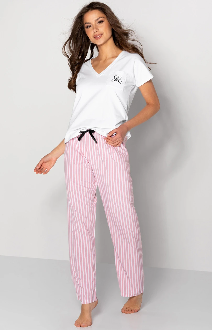 Dámské pyžamo sestávající z halenky a dlouhých kalhot. Halenka s krátkými rukávy, špičatým výstřihem a kapsou na hrudi. Dlouhé kalhoty s bílými a růžovými pruhy, bez kapes, s ozdobnou mašlí v pase.