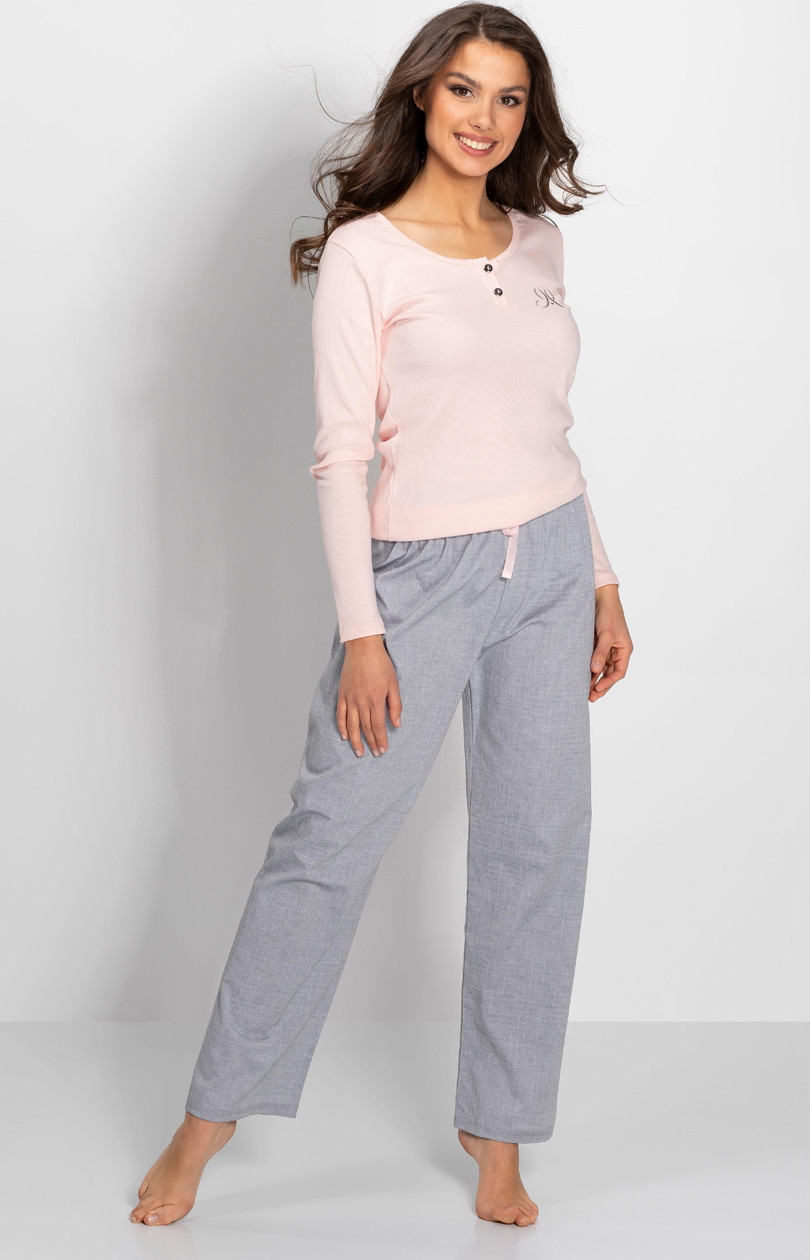 Dvoudílné dámské pyžamo Momenti Per Me Linda. Halenka s dlouhými rukávy a knoflíky ve výstřihu ve světle růžové barvě. Nášivka s logem značky na přední straně. Kalhoty jsou také dlouhé s gumou a mašlí v pase. Pohodlná a atraktivní nabídka nočního oblečení.