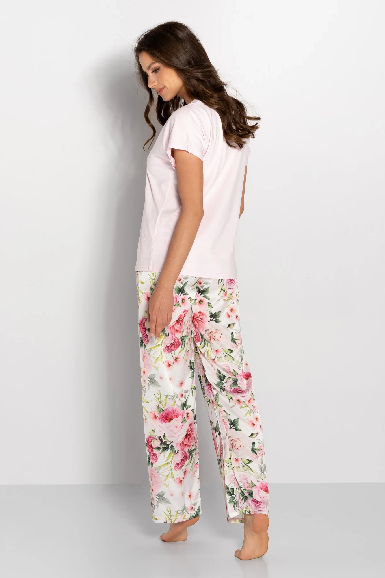 Dámské pyžamo sestávající z halenky a kalhot. Košile s krátkými rukávy a výstřihem ve tvaru srdce. Dlouhé kalhoty s potiskem ve volném, pohodlném střihu s ozdobnou mašlí.