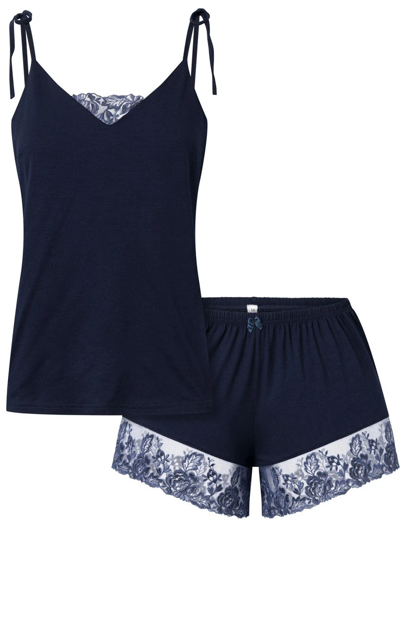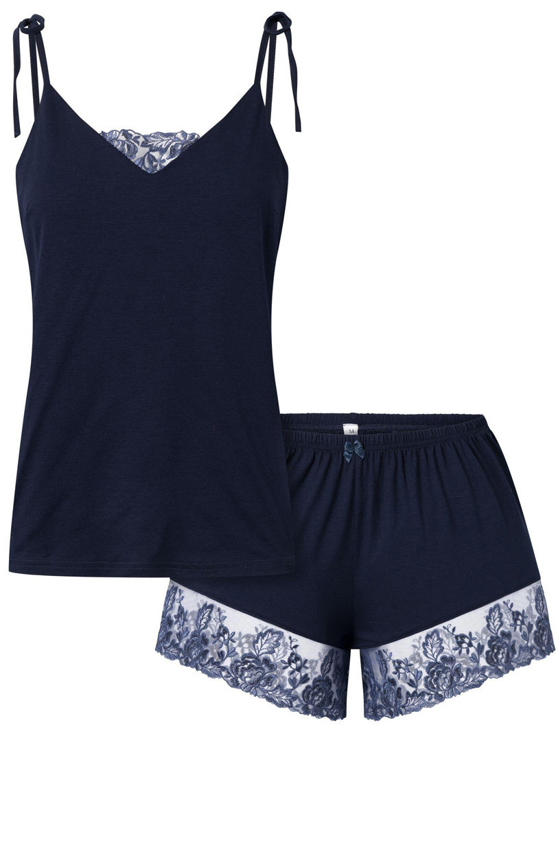 Krásné dámské pyžamo z příjemné viskózy Momenti Per me Daphne. Dvoudílná tmavě modrá souprava s košilkou na tenkých zavazovacích ramínkách. Výstřih ve tvaru písmene V zdobí jemná, elegantní krajka. Spodní díl tvoří volné, krátké šortky s nohavičkami zakončenými proužky krajky. V pase je pružný pásek s drobnou saténovou mašličkou. Vysoce kvalitní pyžamo, měkké jako peříčko a velmi příjemné na nošení.