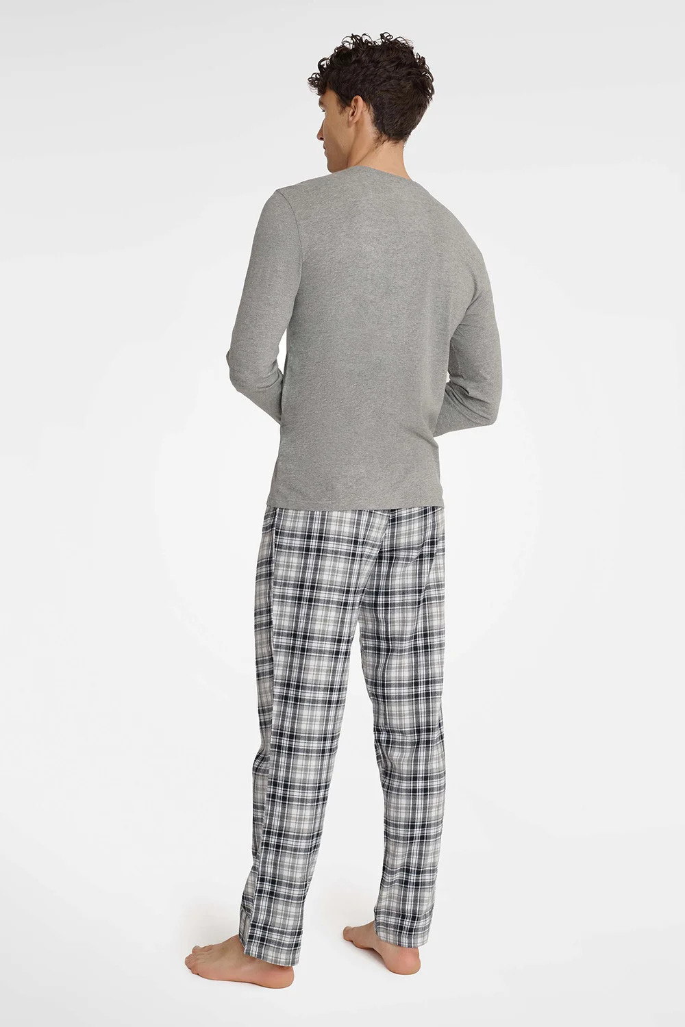 Pánské pyžamo sestávající z trička a kalhot. Tričko s dlouhými rukávy a půlkulatým výstřihem. Dlouhé kalhoty s potiskem, elastickým pasem a zavazováním. .