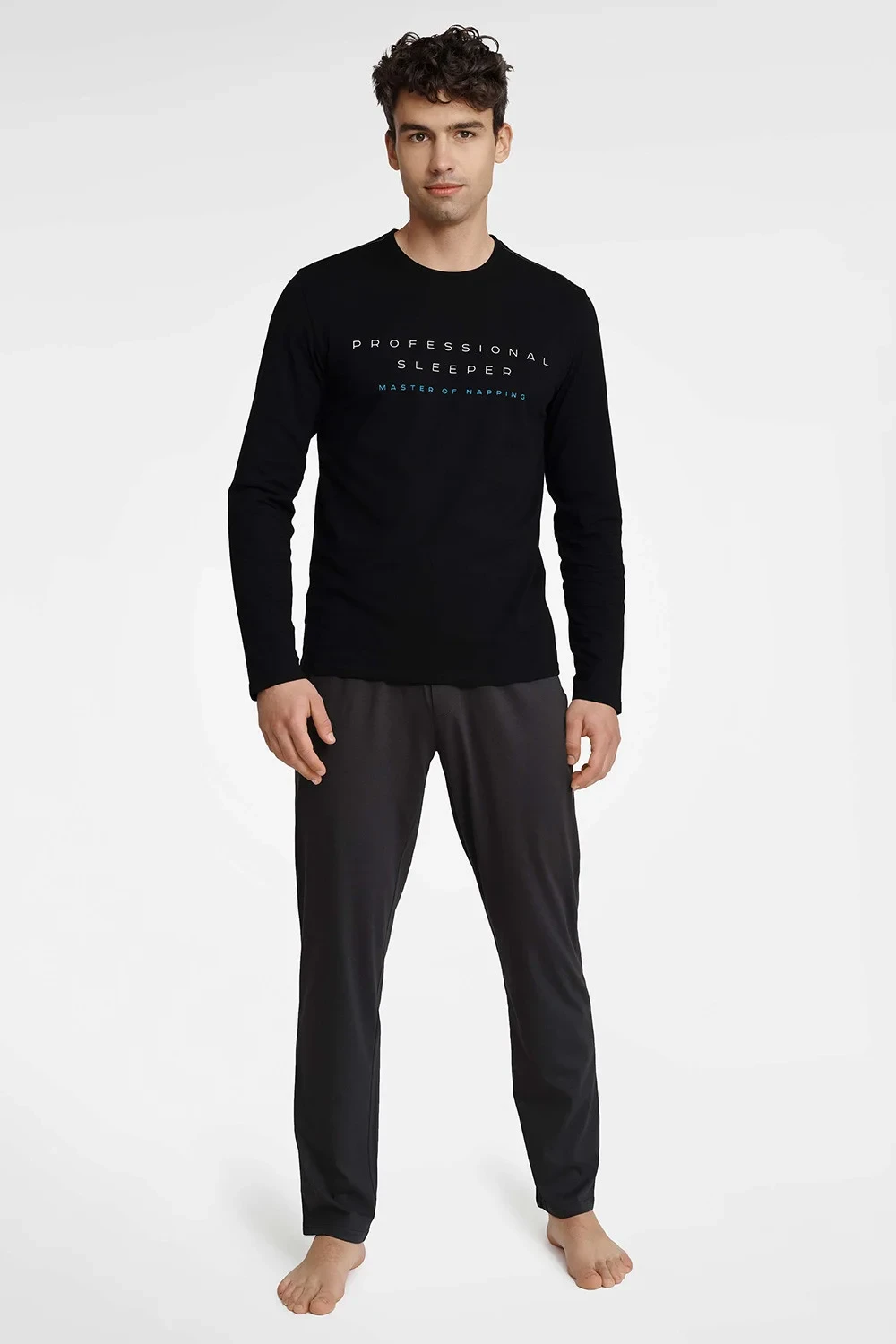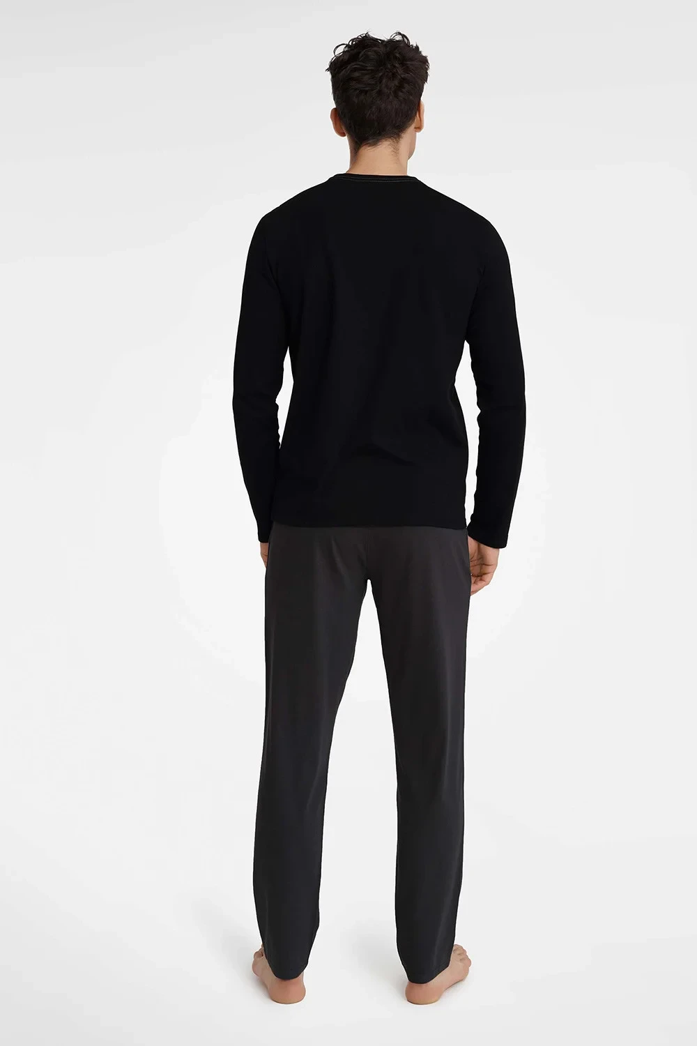 Pánské pyžamo sestávající z trička a kalhot. Tričko s dlouhými rukávy a půlkulatým výstřihem. Dlouhé kalhoty s elastickým pasem.