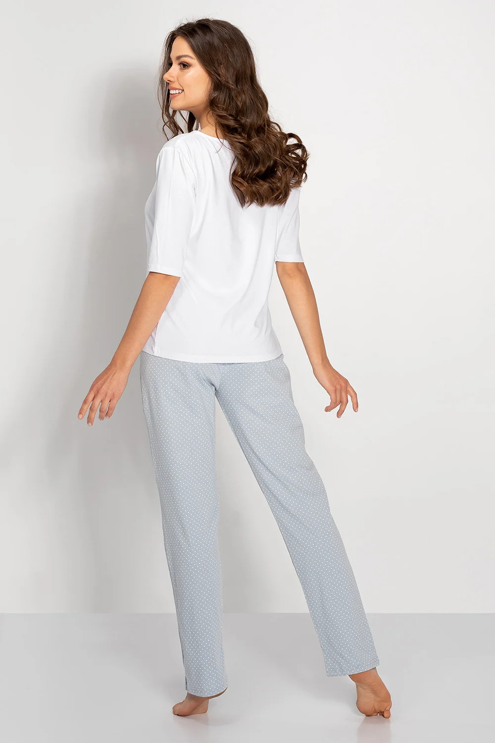 Toto dámské pyžamo je kombinací elegance, pohodlí a kvality. Bylo navrženo a ušito v Polsku, což zaručuje nejvyšší kvalitu zpracování. Výstřih do U dodává pyžamu jemnost a ženský půvab. Jemné barvy a decentní design z něj činí ideální volbu pro každodenní nošení i pro zvláštní příležitosti. Materiál tohoto pyžama je mimořádně měkký a prodyšný, umožňuje pokožce dýchat a zajišťuje maximální pohodlí. Tričko i kalhoty jsou pohodlné a prodyšné, takže vám umožní klidný spánek po celou noc. Kalhoty jsou dlouhé, nadměrné velikosti a mají elastický pas pro volnost pohybu a pohodlí. Pyžamo je navíc vyrobeno z přírodních materiálů, které jsou šetrné k pokožce. Jedná se o dvoudílnou soupravu, která kombinuje elegantní střih s vysokou kvalitou zpracování. Tato pyžamová souprava je ideální pro ženy, které ocení eleganci a pohodlí.