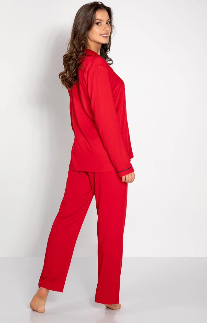 Tato dámská pyžama jsou kvintesencí pohodlí a elegance. Skládá se z košile s dlouhými rukávy na knoflíky a dlouhých kalhot s pružným pasem. Výstřih do V dodává jemnost a elegantní lemy (lemování) ozvláštňují vzhled. Hladká tkanina je měkká, prodyšná a nedráždivá pro pohodlný spánek. Náprsní kapsa je praktickým doplňkem a volný střih zaručuje volnost pohybu. Díky jedinečnému designu a pohodlí je toto pyžamo také skvělým nápadem na dárek.
