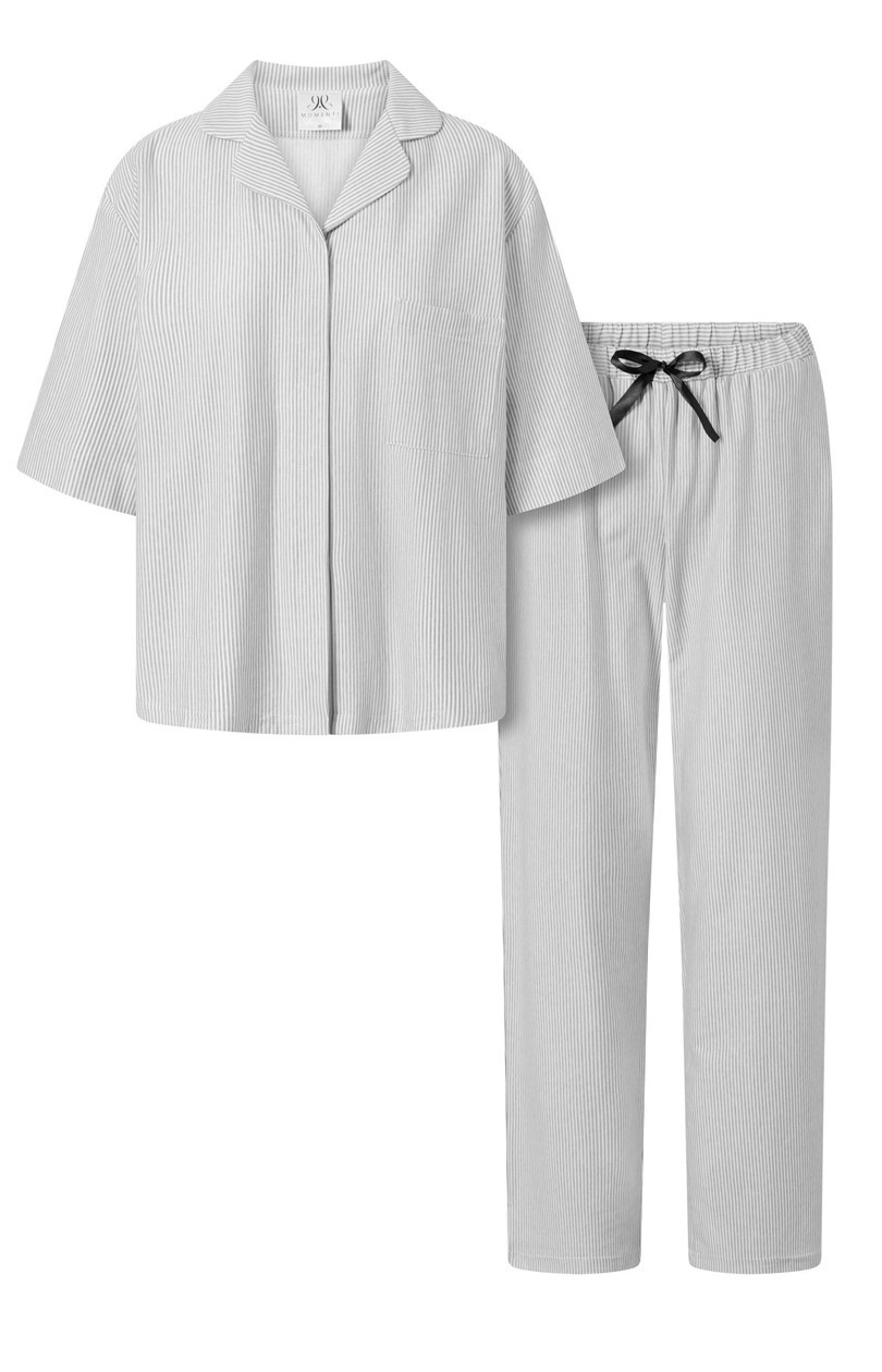 Toto dámské pyžamo v sobě spojuje eleganci, pohodlí a jedinečný design. Košile má výstřih do V a pro větší eleganci se zapíná na knoflíky. Měkká a vzdušná tkanina poskytuje maximální pohodlí a její hypoalergenní vlastnosti zajistí, že nedráždí pokožku. Košile i kalhoty mají kapsy, což jim dodává na praktičnosti. Ženský styl a oversize střih poskytují volný a pohodlný střih. Pyžamo je vyrobeno z jemné tkaniny a zakončeno ozdobným límcem. Pyžamo má navíc tlumené módní barvy a vkusnou mašli v pase. Jedná se o polský výrobek nejvyšší kvality. Díky dvoudílné sadě je toto pyžamo ideálním dárkem pro vás nebo jinou osobu. Jeho elegantní střih podtrhne eleganci a jedinečnost každé ženy.
