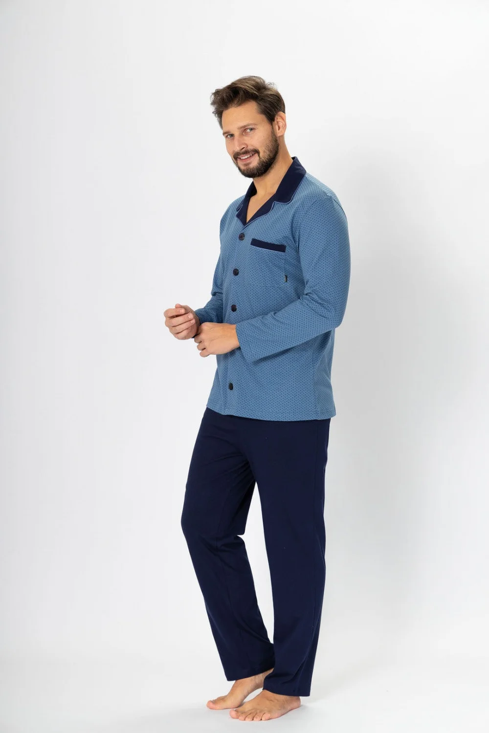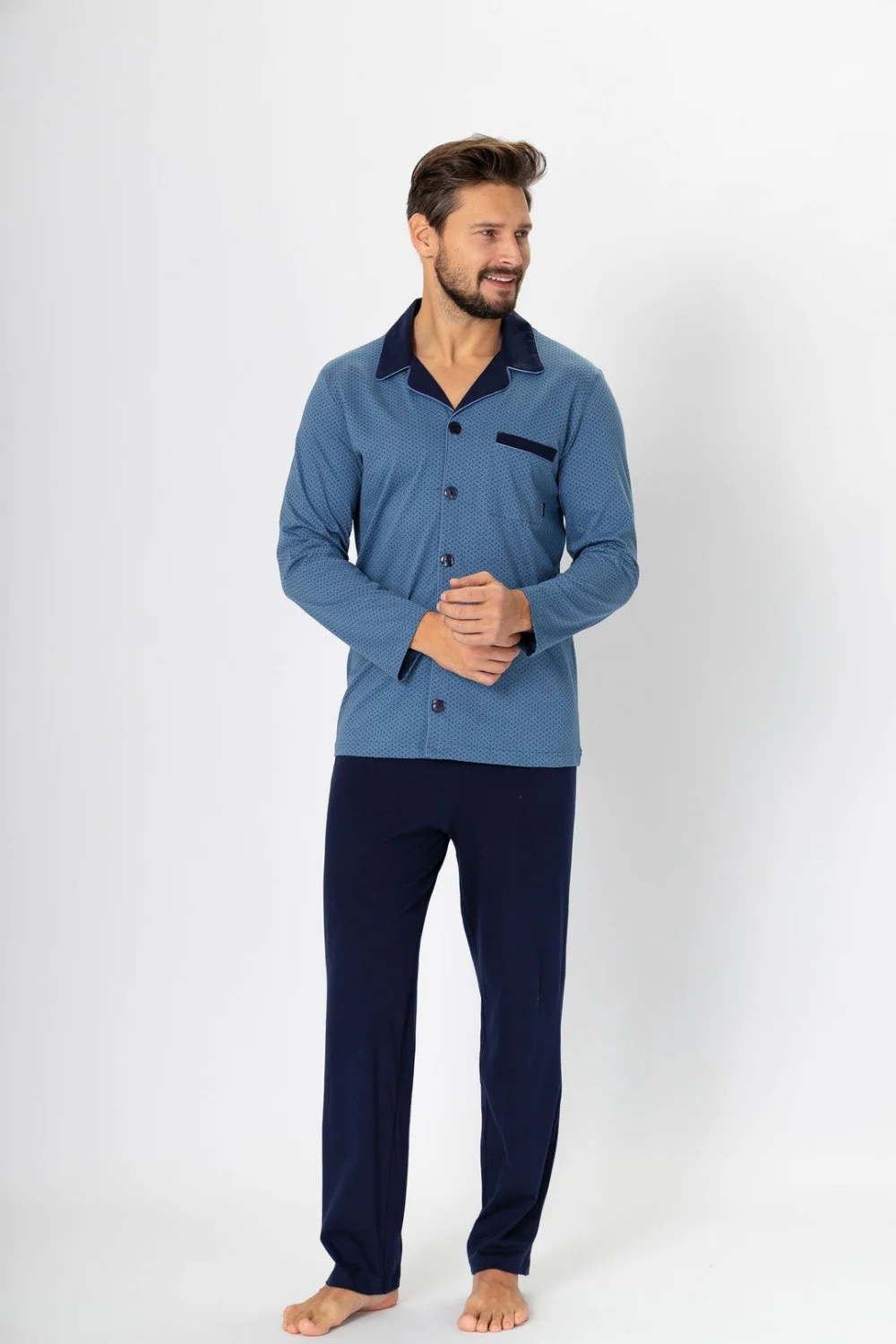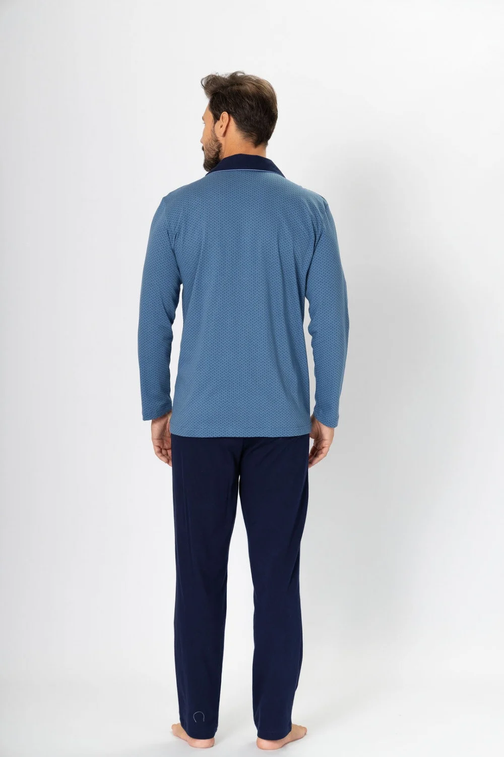 Klasické a elegantní pánské pyžamo s rozepínáním. Vrchní díl pyžama s jemným vzorem. Blůza je lemována kontrastním úpletem v barvě kalhot. Barevné saténové lemování dodává tomuto pyžamu elegantní vzhled. Velké knoflíky dokonale ladí s celkovým designem. Dlouhé kalhoty s rovným volným střihem.