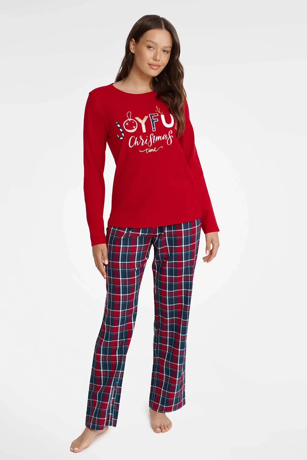 Dámské pyžamo Glance je jedinečné noční oblečení, které vás svátečně naladí, jakmile si ho obléknete. Módní souprava se skládá z červené halenky s dlouhými rukávy a pohodlných kostkovaných kalhot. Tričko navíc zdobí velký nápis Joyful Christmas time. Dámské dvoudílné pyžamo Glance je vyrobeno z měkké bavlny, takže vás jemně obepne a poskytne vám pohodlí během dlouhých zimních večerů.