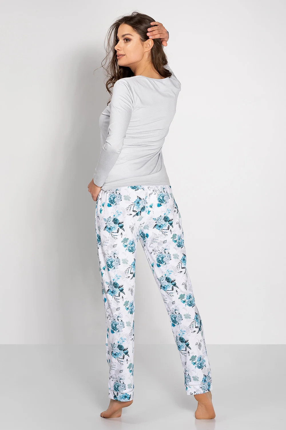 Toto krásné dámské pyžamo s halenkou s dlouhými rukávy v sobě spojuje pohodlí, eleganci a péči o zdraví. Má certifikát OEKO-TEX Standard 100, který dokazuje, že je hypoalergenní a bezpečné pro pokožku. Výstřih ve tvaru písmene U, zakončený jemným lemováním, dodává halence ženský a elegantní charakter. Elegantní lemy (lemování) a jemné barvy dělají z tohoto pyžama nejen pohodlné oblečení na spaní, ale také stylový kousek oblečení. Dlouhé kalhoty, které zdůrazňují siluetu, mají v pase gumu, která zaručuje volnost pohybu a pohodlné nošení. Jsou vyrobeny z přírodních materiálů, které se po vyprání nedeformují a nedráždí pokožku. Vysoká kvalita potištěné látky zajišťuje odolnost a estetiku. Jedná se nejen o praktickou soupravu pro každodenní nošení, ale také o perfektní nápad na dárek. Design a výroba v Polsku zaručují nejen elegantní střih, ale také solidnost zpracování.