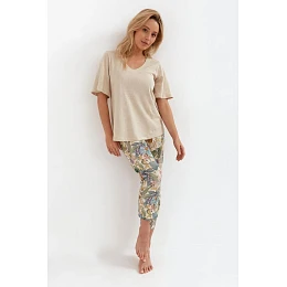 Výrazné dvoudílné dámské pyžamo. Melanžové tričko z viskózy s příměsí lnu, krátké rukávy, výstřih do V.