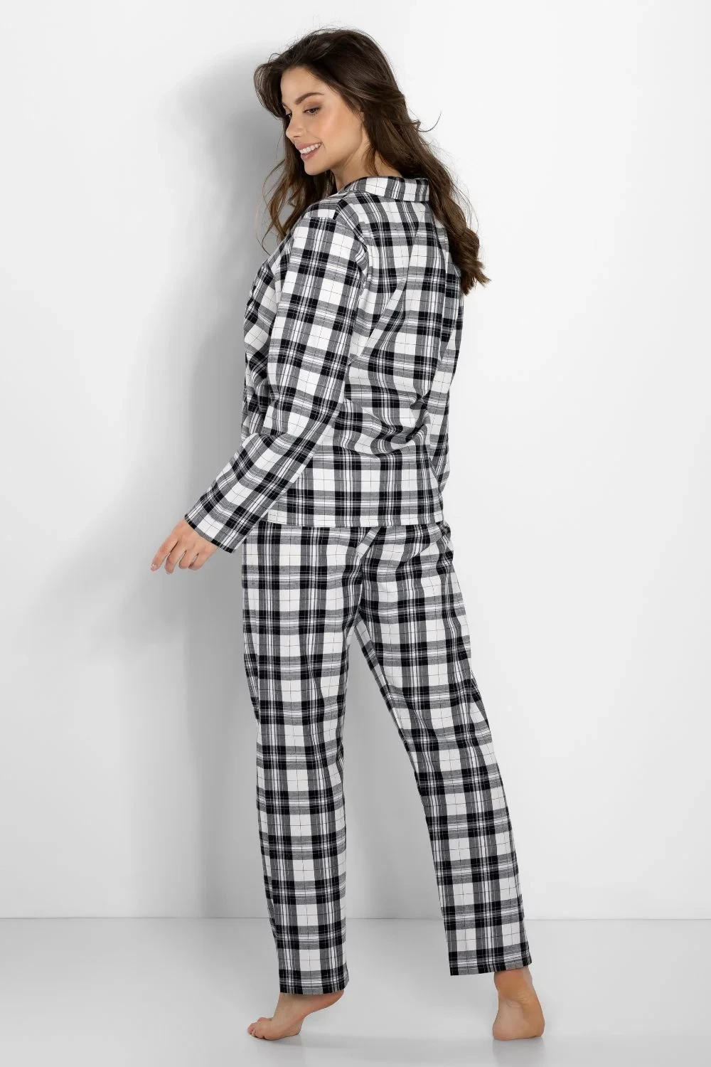 Dámská pyžama navržená a ušitá v Polsku představují eleganci a pohodlí v jednom. Souprava se skládá z trička s dlouhým rukávem a dlouhých kalhot. Košile má výstřih do V, límeček, rukávy zakončené manžetami, volný oversize střih a zapíná se na knoflíčky. Kalhoty mají rovněž volný, pohodlný střih a elastický pas. Pyžamo je vyrobeno z přírodních materiálů a umožňuje pokožce dýchat. Kvalitní zpracování zajišťuje dlouhou životnost. Vyhněte se sušení v sušičce. Díky jemnému a elegantnímu designu je pyžamo ideální také jako dárek.