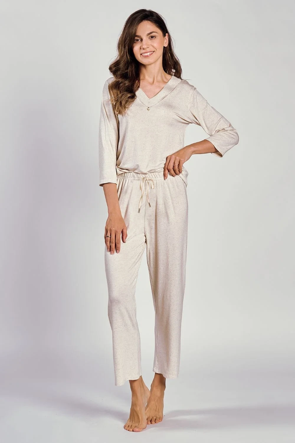 Dámské pyžamo z melanžové viskózy a lnu. Halenka s výstřihem do V a 3/4 rukávy. Dlouhé rovné kalhoty , zdobené v pase motýlkem. Ideální komplet jako pyžamo a domácí běžné oblečení.