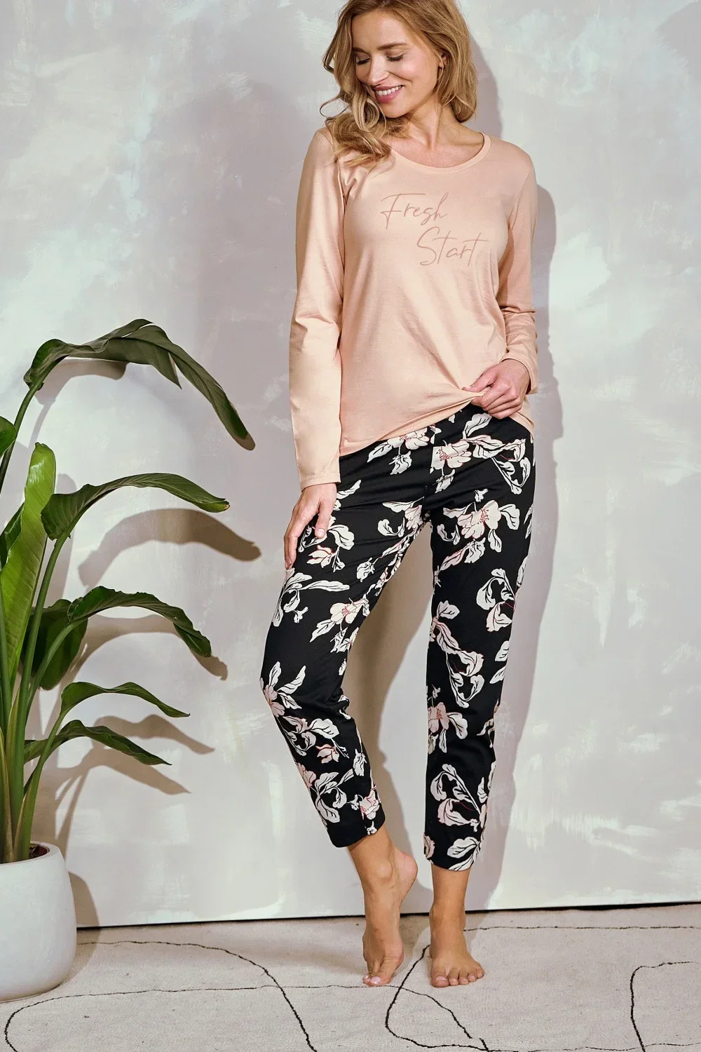 Dámské pyžamo ideální pro chladnější noci. Skládá se z halenky s dlouhým rukávem a dlouhých kalhot. Halenka má půlkruhový výstřih a jemný potisk na horním dílu, který dodává jemnou eleganci. Je měkká a pohodlná, takže skvěle poslouží jako pohodlné oblečení na spaní. Kalhoty bez kapes mají dlouhý střih a ozdobný potisk, který vytváří ucelený stylový komplet. Elastický pas zaručuje dokonalé přizpůsobení a pohodlné nošení po celou noc. Díky této kombinaci pohodlí a stylu je toto pyžamo ideální volbou pro každou noc.