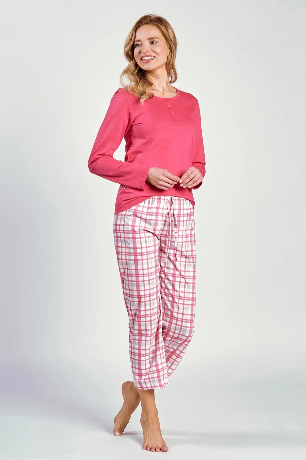Dámské pyžamo, které v sobě spojuje pohodlí a styl a skládá se z halenky s dlouhými rukávy a kalhot v délce 7/8. Halenka má půlkruhový výstřih a ozdobné knoflíky, které se neodepínají, což jí dodává šarm a eleganci. Volný, pohodlný střih a měkká a vzdušná tkanina zajišťují maximální pohodlí při nošení. Šortky mají jemný potisk, jsou bez kapes a díky 7/8 délce jsou ideální pro všechna roční období. Elastický pas a vázání v pase zaručují dokonalé přizpůsobení a pohodlí po celou noc. Jedná se o harmonickou kombinaci funkčnosti a stylu, díky které bude každá noc mimořádně pohodlná.