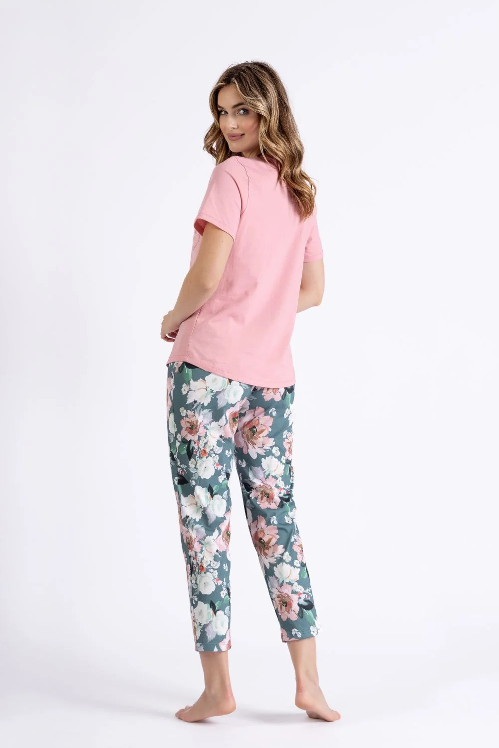 Dámský pyžamový set spojující pohodlí a jemný šarm. Tričko s krátkým rukávem a Výstřihem s kapsou na hrudi zdobenou jemnou mašlí má volný a pohodlný střih, ideální pro spaní. Vyrobena z měkké a prodyšné látky, poskytuje plný komfort při nošení. Celý set je balený v taštičce, což z něj dělá také skvělý dárek. Kalhoty s délkou 7/8 s potiskem bez kapes mají pravidelný střih, který se přizpůsobí postavě. Elastický pás a ozdobná mašle dodávají pyžamu eleganci a šarm.
