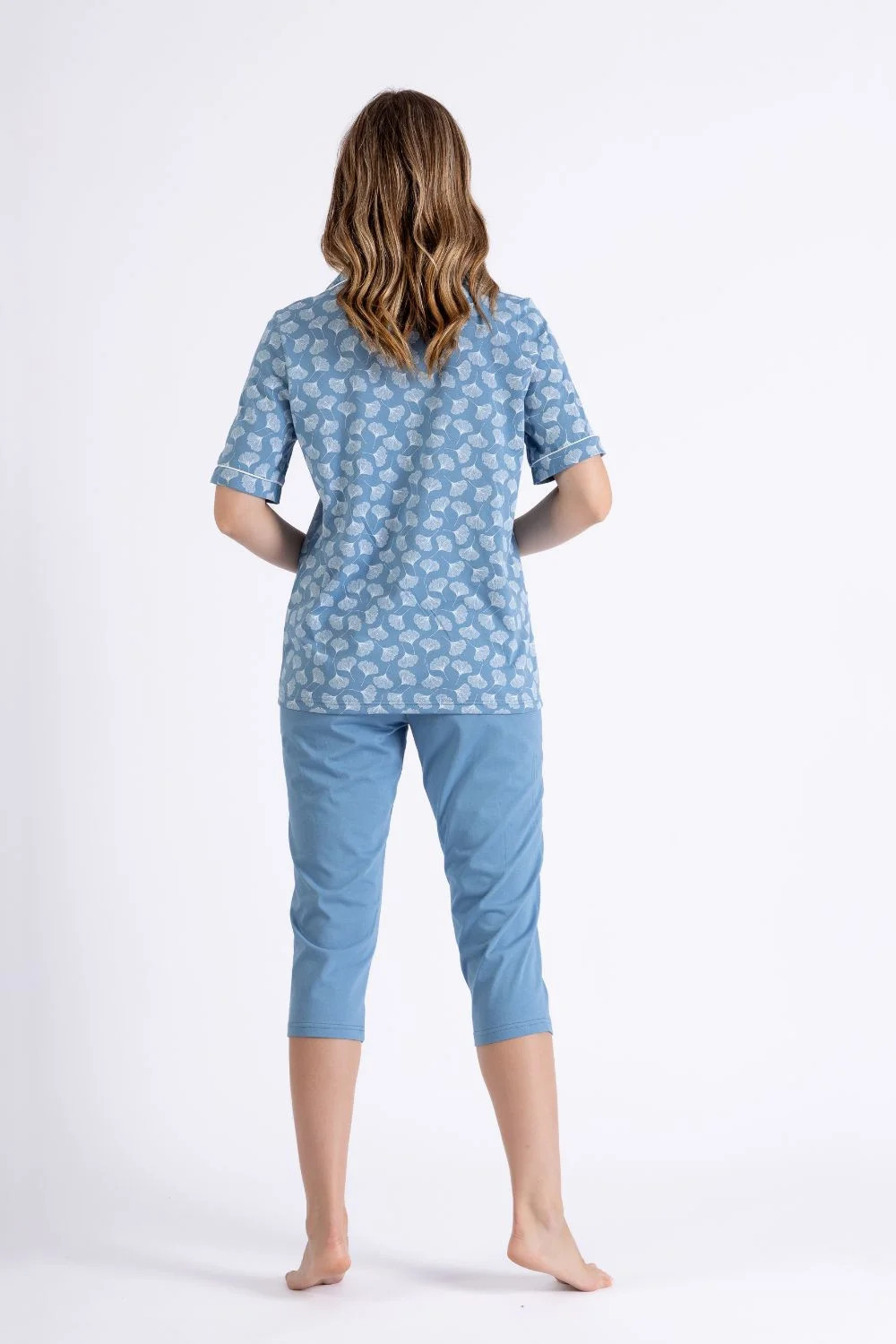Elegantní dámské pyžamo s výjimečným dokončením (piping) je ideální volbou pro ty, kteří ocení pohodlí a styl. Košile s dlouhým rukávem, zapínací na knoflíky, je zdobena elegantním límcem a kapsami po stranách. Vyrobená z měkké, prodyšné látky s potiskem, zaručuje pohodlí a volnost. Volný střih košile a kalhoty typu 3/4 s gumou v pasu zajistí pohodlí během spánku a relaxace. Celkově je vysoká kvalita zachována, což zdůrazňuje elegantní charakter pyžama. Baleno v tašce, je skvělou volbou jako dárek.