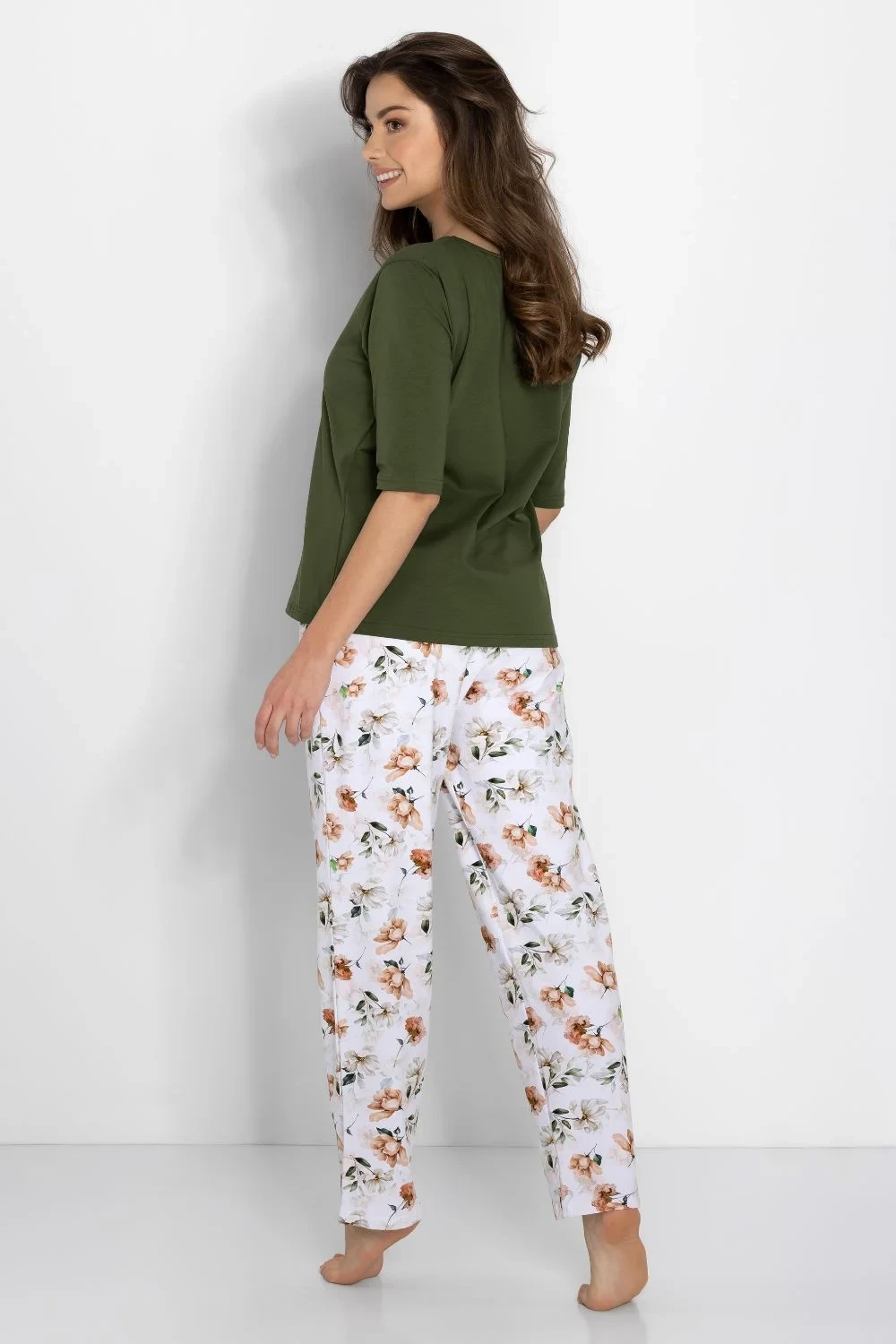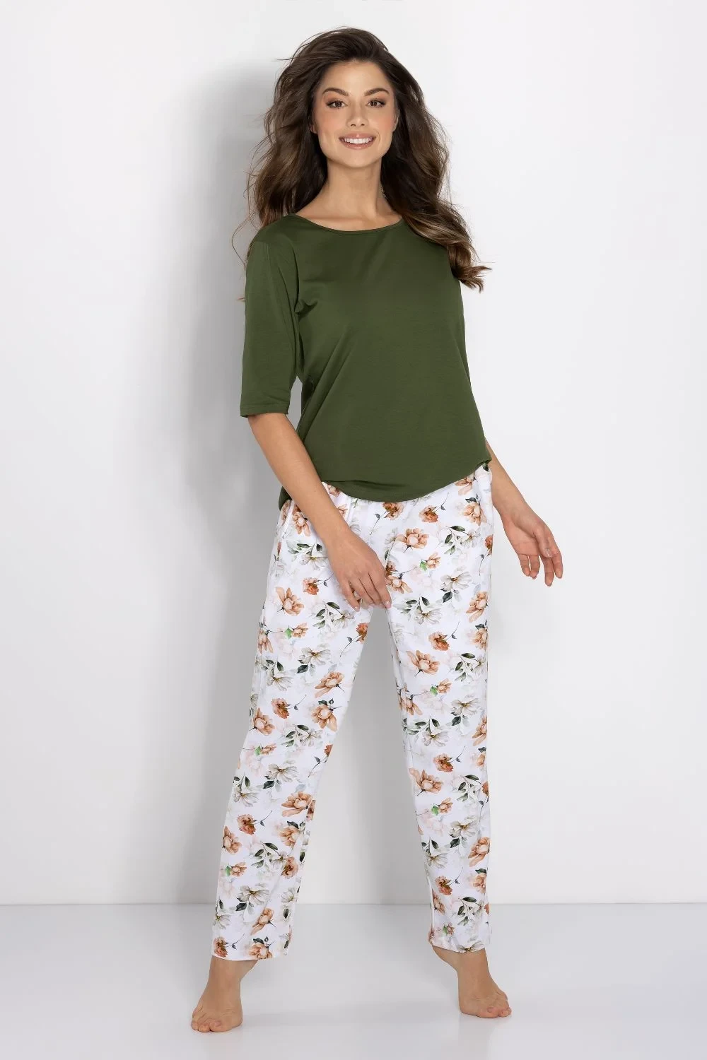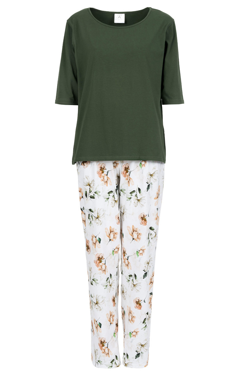 Objevte výjimečnou dámskou pyžamu, která spojuje eleganci s pohodlím, ideální jak pro spánek, tak jako homewear. Dvoudílná sada se skládá z trička s 3/4 rukávem a dekoltem typu U, vyrobeného v jemné barevné kombinaci, která zdůrazňuje ženský styl. Volné horní a spodní díly s oversized střihem a kapsami po stranách zaručují volnost a pohodlí. Dlouhé kalhoty s elastickým pasem jsou vyrobeny z elastického, přírodního materiálu, který zajišťuje příjemné přizpůsobení. Pyžamo je hypoalergenní, má certifikát OEKO-TEX Standard 100 a vyniká vysokou kvalitou potisku. Navrženo a vyrobeno v Polsku, je to skvělá volba pro každou ženu, která ocení jemný styl a pohodlí.