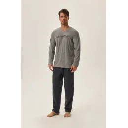 Pyžamo pro muže Japan potěší každého milovníka klasických souprav na spaní. Sada je v šedé barvě. Skládá se z košile s dlouhým rukávem a tmavších kalhot s délkou po kotníky. Měkká bavlněná pletenina zajišťuje, že pyžamo je příjemné na dotek. Vrchní část pyžama je zdobena nápisem s názvem značky.