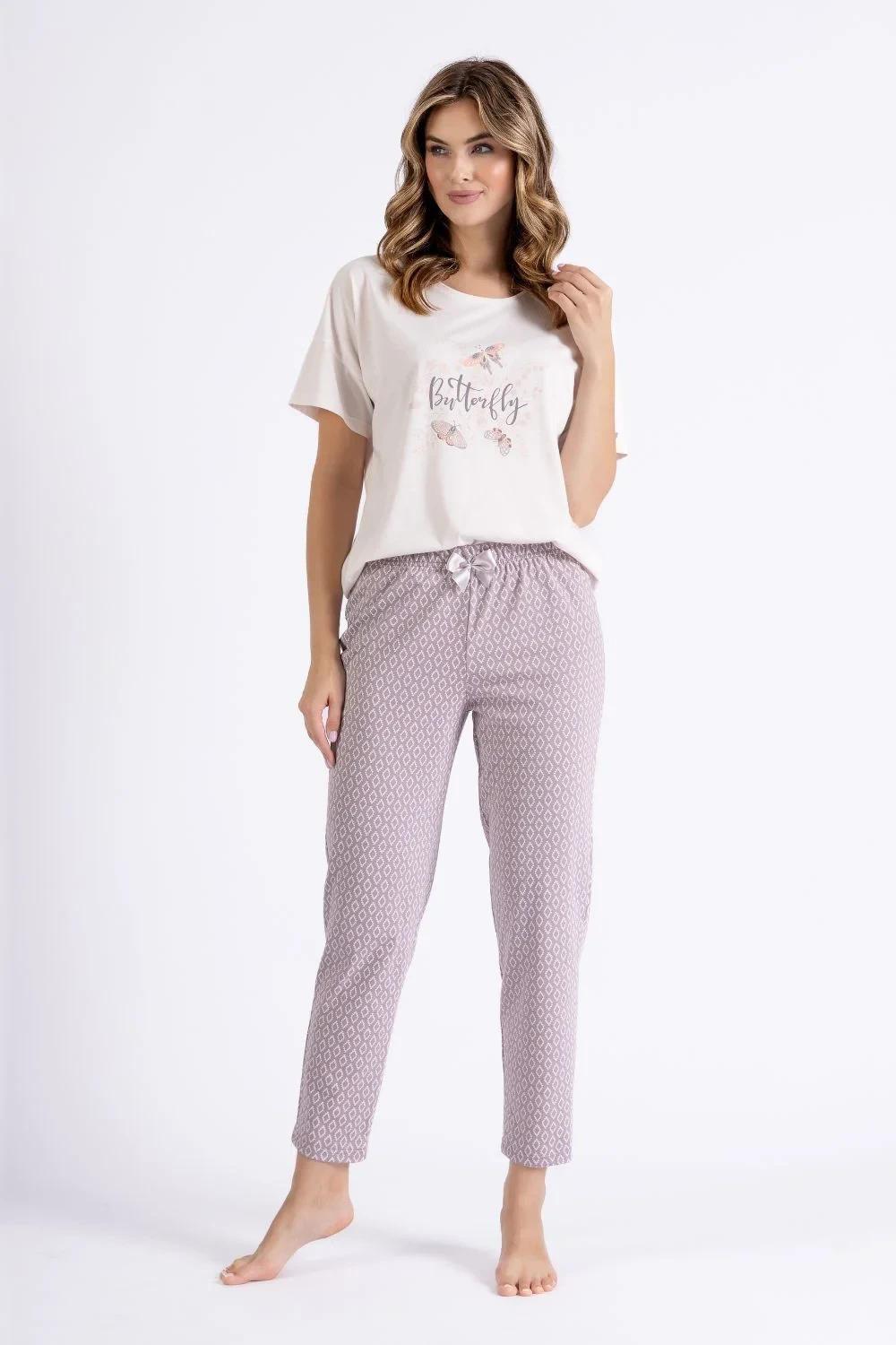 Dámská pyžama, která spojuje pohodlí a styl. Tričko s krátkým rukávem a kulatým výstřihem, zdobené nápisem, má volný, pohodlný střih, ideální na každodenní večery. Vyrobeno z měkké a prodyšné látky, zajišťuje pohodlí po celou noc. Kalhoty s délkou 7/8 s potiskem, bez kapes, dokonale doplňují sestavu. V pase je elastická guma a ozdobná mašlička, která dodává šarm a zdůrazňuje pečlivost výroby. Celkově vyrobeno z vysoce kvalitních materiálů, zaručující trvanlivost a pohodlí. Bavlna 100 %