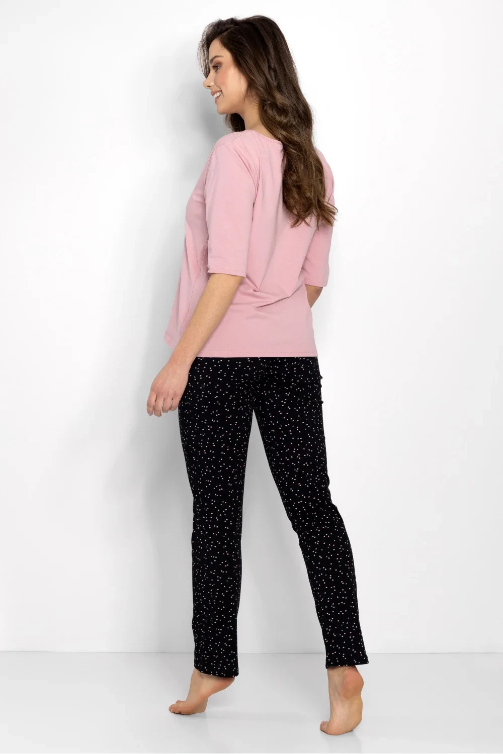Toto dámské pyžamo s elegantním a ženským designem je ideální volbou pro dárky i každodenní domácí nošení. Je vyrobeno z přírodních, hypoalergenních materiálů, je šetrné k pokožce, ale zároveň měkké a prodyšné pro celodenní pohodlí. Halenka s 3/4 rukávy a výstřihem do U má přiléhavý střih, který jemně zvýrazňuje siluetu. Dlouhé kalhoty úzkého střihu dokonale přiléhají k tělu a elastický pas zajišťuje pohodlné nošení. Tlumené barvy a kvalitní potisk látky kalhot dodávají pyžamu na eleganci. Certifikát OEKO-TEX Standard 100 potvrzuje bezpečnost tkanin. Je navrženo a ušito v Polsku s důrazem na nejvyšší kvalitu.