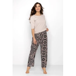 Elegantní a pohodlný dámský pyžamový set ve 2 dílech, ideální jak pro spaní, tak jako pohodlné oblečení doma. Tričko s 3/4 rukávem a výstřihem typu U je vyrobeno z jemné viskózy, která je šetrná k pokožce a poskytuje vynikající prodyšnost. Jeho volný střih umožňuje volný pohyb a jemná barevnost dodává subtilitu a ženský šarm. Kalhoty s dlouhými nohavicemi, navržené v pohodlném, volném střihu, mají v pase gumu, což zaručuje ideální přizpůsobení a pohodlí nošení. Celý set je vyroben z přírodních materiálů, splňuje nejvyšší standardy kvality, což potvrzuje certifikace OEKO-TEX Standard 100. Navržený a vyrobený v Polsku, pyžamo spojuje preciznost zpracování s péčí o detaily. Je to ideální volba pro ženy, které hledají produkt spojující pohodlí, estetiku a starost o životní prostředí. Složení: Horní část: 96% bavlna, 4% elastan Dolní část: 100% viskóza