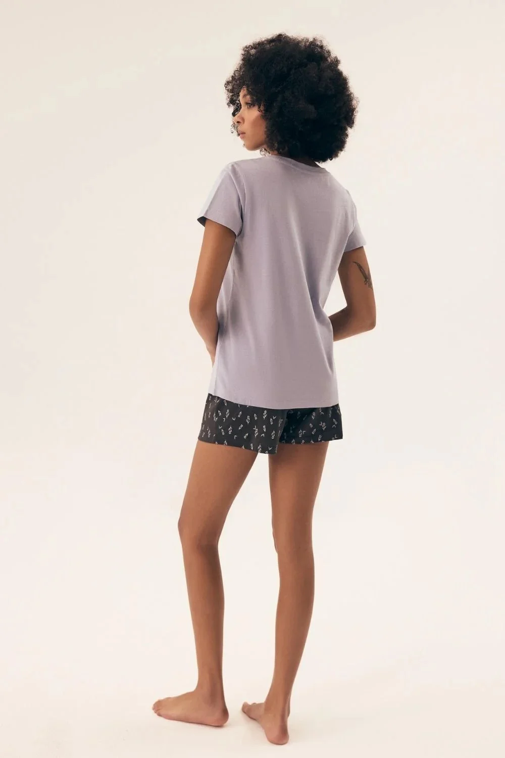 Dámský pyžamo spojuje pohodlí a styl, poskytující pohodlný spánek a relaxaci v domácím prostředí. Tričko s krátkým rukávem má polokruhový výstřih a ozdobný nápis, který dodává moderní charakter. Volný a pohodlný střih zaručuje volnost pohybu a pohodlí nošení. Krátké kalhoty se vyznačují roztomilým potiskem a elastickým páskem v pasu pro ideální přizpůsobení. Chybějící kapsy zajišťují, že jsou lehké a pohodlné. Pyžamo je vyrobeno z měkké a prodyšné látky, což ho činí ideální volbou na každé roční období. Jedná se o spojení stylu a pohodlí, které se hodí do každé ženské šatní skříně!