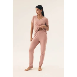 Tato dámská pyžama typu basic je ideální kombinací pohodlí a klasické elegance. Vyrobená z měkké, prodyšné látky umožňuje kůži dýchat a poskytuje pohodlí po celou noc. Tričko s krátkým rukávem má výstřih ve tvaru písmene V, který jemně zdůrazňuje krk, a spodní část s lemem přidává jejímu vzhledu něžný šarm. Volný, pohodlný střih zaručuje volnost pohybů. Dlouhé kalhoty bez kapes jsou vybaveny širokým elastickým pasem, skvěle padnou ke střihu a zajišťují pohodlí nošení. Celý set je balený v praktickém sáčku, což z něj dělá skvělý dárek. Ideální volba pro ženy, které ocení jednoduchost, kvalitu a pohodlí!