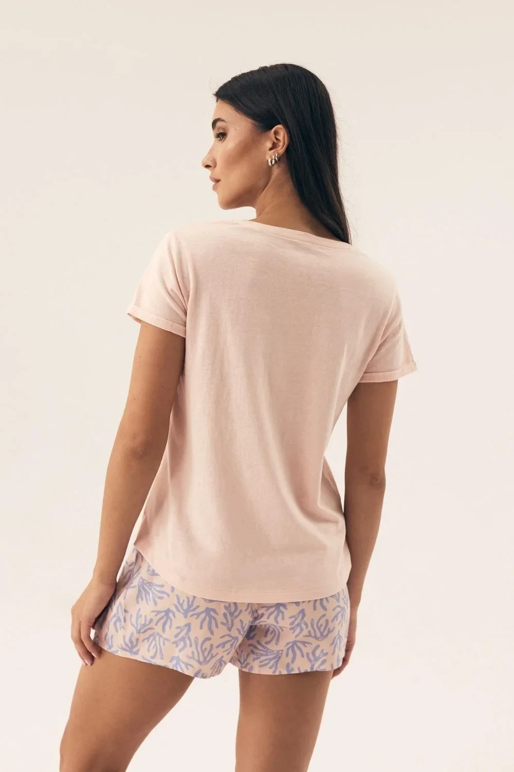 Tato dámská pyžama je skvělou volbou pro ženy, které oceňují pohodlí a styl. Tričko s krátkým rukávem má Výstřih, který jemně zdůrazňuje krk, a módní potisk dodává jeho jedinečný charakter. Vyrobeno z měkké a prodyšné látky, zaručuje pohodlí po celou noc. Krátké kalhoty s potiskem doplňují celkový vzhled, nabízejí pohodlí a lehkost. Elastický pás zajistí ideální přizpůsobení a volný, pohodlný střih umožní volné pohyby. Pyžamo je skvělou volbou pro klidné noci, zajišťující pohodlí, které se hodí i jako stylové oblečení pro domov! Složení: Horní část: 100% bavlna Dolní část: 100% viskóza