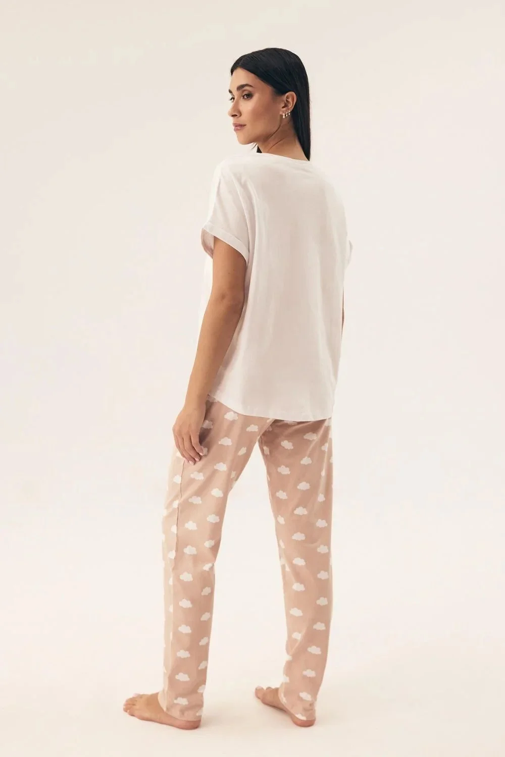 Tato dámská pyžama je ideální volbou pro ženy hledající spojení pohodlí a decentního stylu. Tričko s krátkým rukávem a kulatým výstřihem, zdobené módním potiskem, má volný a pohodlný střih, který poskytuje plnou volnost pohybu. Vyrobené z měkké a prodyšné látky, skvěle poslouží v každém ročním období. Kalhoty s potiskem, dlouhé, bez kapes, jsou pohodlné a stylové. Široký elastický pás zajistí perfektní přizpůsobení a pohodlí při nošení po celou noc. Střízlivá barevnost pyžama dodává elegantní a nadčasový charakter. Jedná se o ideální pyžamo pro klidný spánek, které zajistí pohodlí a stylový vzhled v domácím útulku. Složení: Horní část: 100% bavlna Dolní část: 95% bavlna, 5% elastan