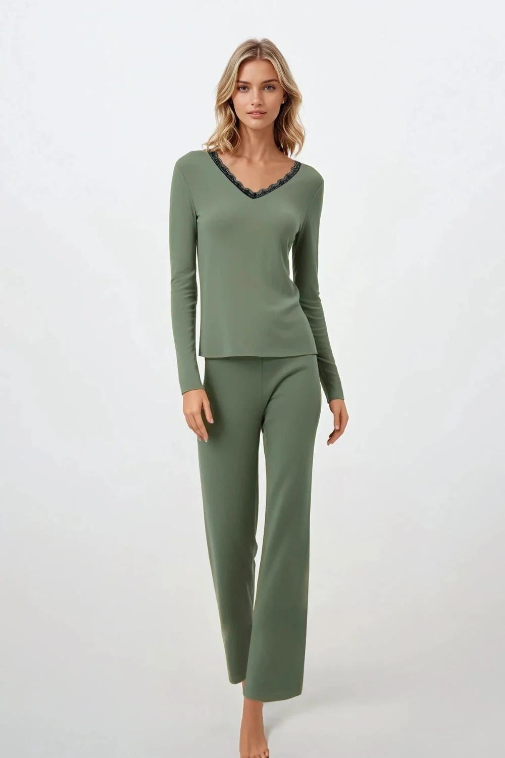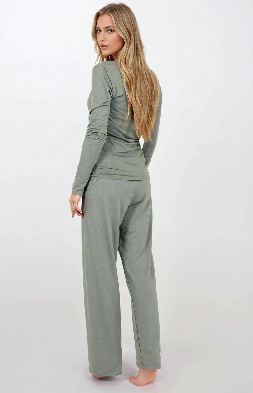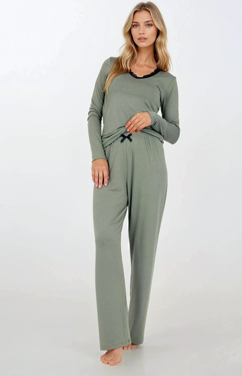 Pyžamo ve 2 dílech navržené s ohledem na eleganci a pohodlí. Výstřih do špičky, jemně zdobený krajkou, dodává ženský šarm a lehkost. Jemná barevnost a hladká látka vytvářejí harmonický celek, ideální k odpočinku a relaxaci. Horní část pyžama s dlouhým rukávem zakončeným elegantní manžetou zajišťuje pohodlí a styl, zatímco kalhoty bez kapes, ve strohém střihu a s gumou v pase, zaručují pohodlí a volnost pohybu. Dlouhé kalhoty zajišťují pohodlí v chladnějších nocích, a měkká a prodyšná látka z jemné viskózy zajišťuje pocit lehkosti a pohodlí po celou noc. Pyžamo je navrženo a ušito v Polsku z materiálů nejvyšší kvality, což z něj činí vynikající volbu jako dárek nebo elegantní domácí oděv.