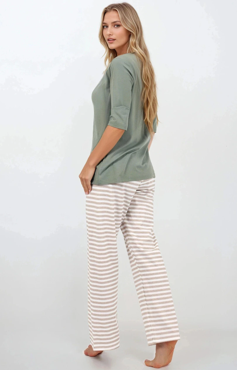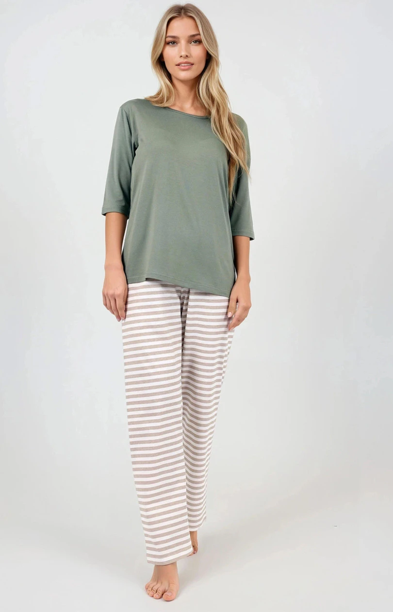 Pyžamo ve 2 částech s elegantním stylem, vytvořené s ohledem na pohodlí a ženský vzhled. Kulatý výstřih a rukáv 3/4 dodávají jemný šarm, zatímco volný, pohodlný střih poskytuje plnou volnost pohybu. Přímá nohavice a širší nohavice kalhot vytvářejí harmonický celek, který není jen pohodlný, ale také elegantní. Pyžamo vyrobené z přírodních materiálů zaručuje vysokou kvalitu a hypoalergenní vlastnosti, což z něj činí ideální volbu i pro citlivou pokožku. Guma v pasu zajistí, že se model ideálně přizpůsobí postavě, poskytující pohodlí po celou noc. Navrženo a ušito v Polsku, pyžamo je skvělou volbou pro domácí nošení a jako dárek. Složení: Horní část: 95% viskóza, 5% elastan Dolní část: 100% bavlna