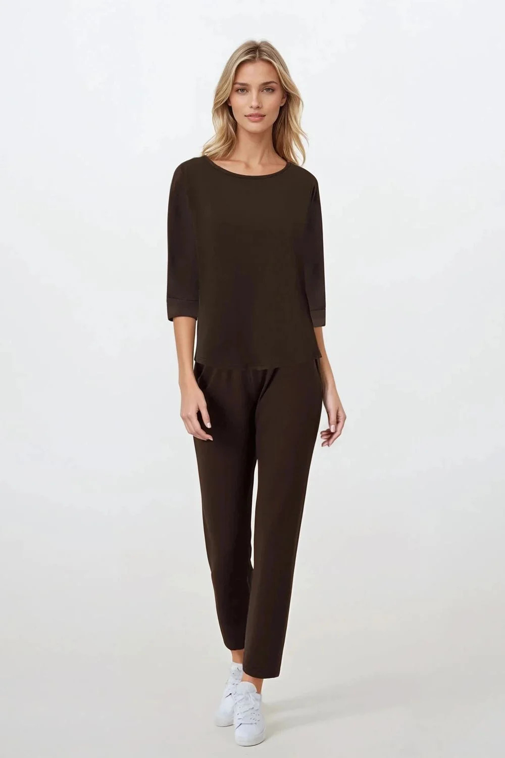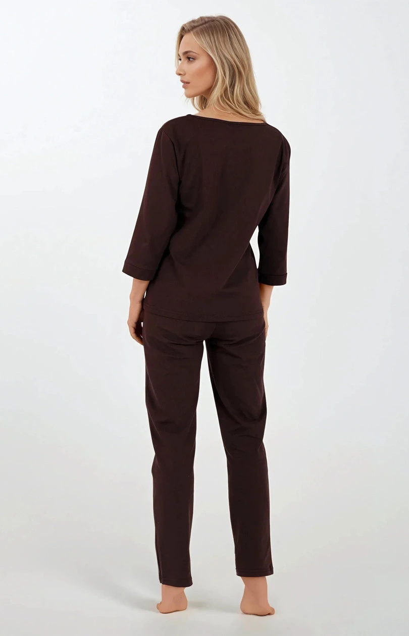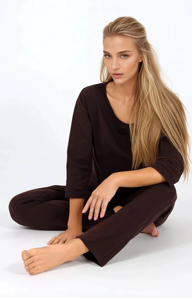Tato dvoudílná pyžama spojuje ženský styl s pohodlím a elegancí, ideální jak pro noční odpočinek, tak jako domácí oblečení. Tričko s 3/4 rukávem a výstřihem typu U vytváří jemnou, ale ženskou siluetu, a rukávy s manžetami dodávají klasický charakter. Pyžamo je vyrobeno z měkké a prodyšné látky, je hypoalergenní a má certifikaci OEKO-TEX Standard 100, co zaručuje, že je bezpečné pro pokožku. Kalhoty slim s dlouhými nohavicemi a elastickým pasem se skvěle přizpůsobují postavě, a absence kapes a minimalistický střih dodávají lehkost. Produkt je 100% vyroben z přírodních materiálů a navržen a ušit v Polsku, co zaručuje nejvyšší kvalitu zpracování.