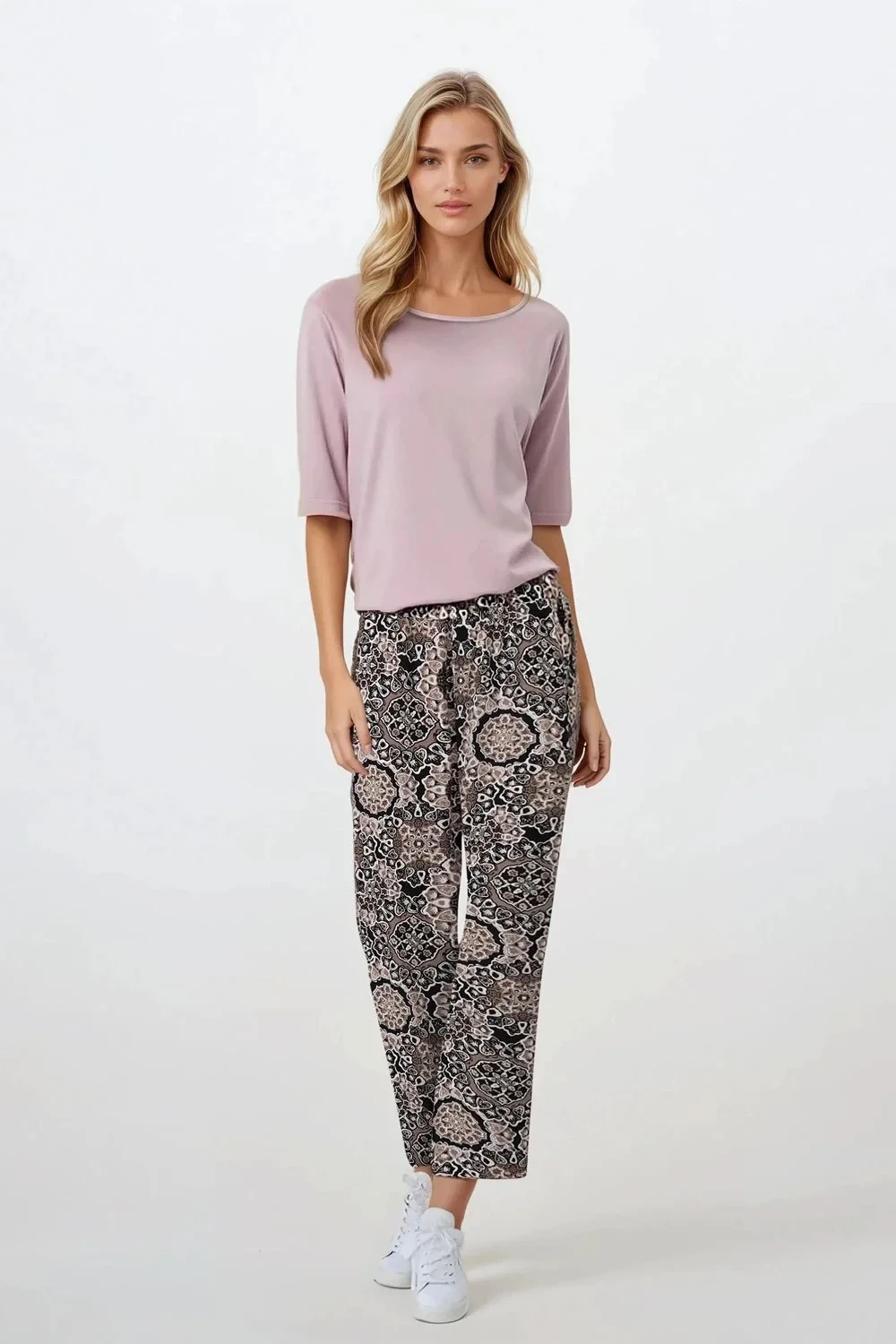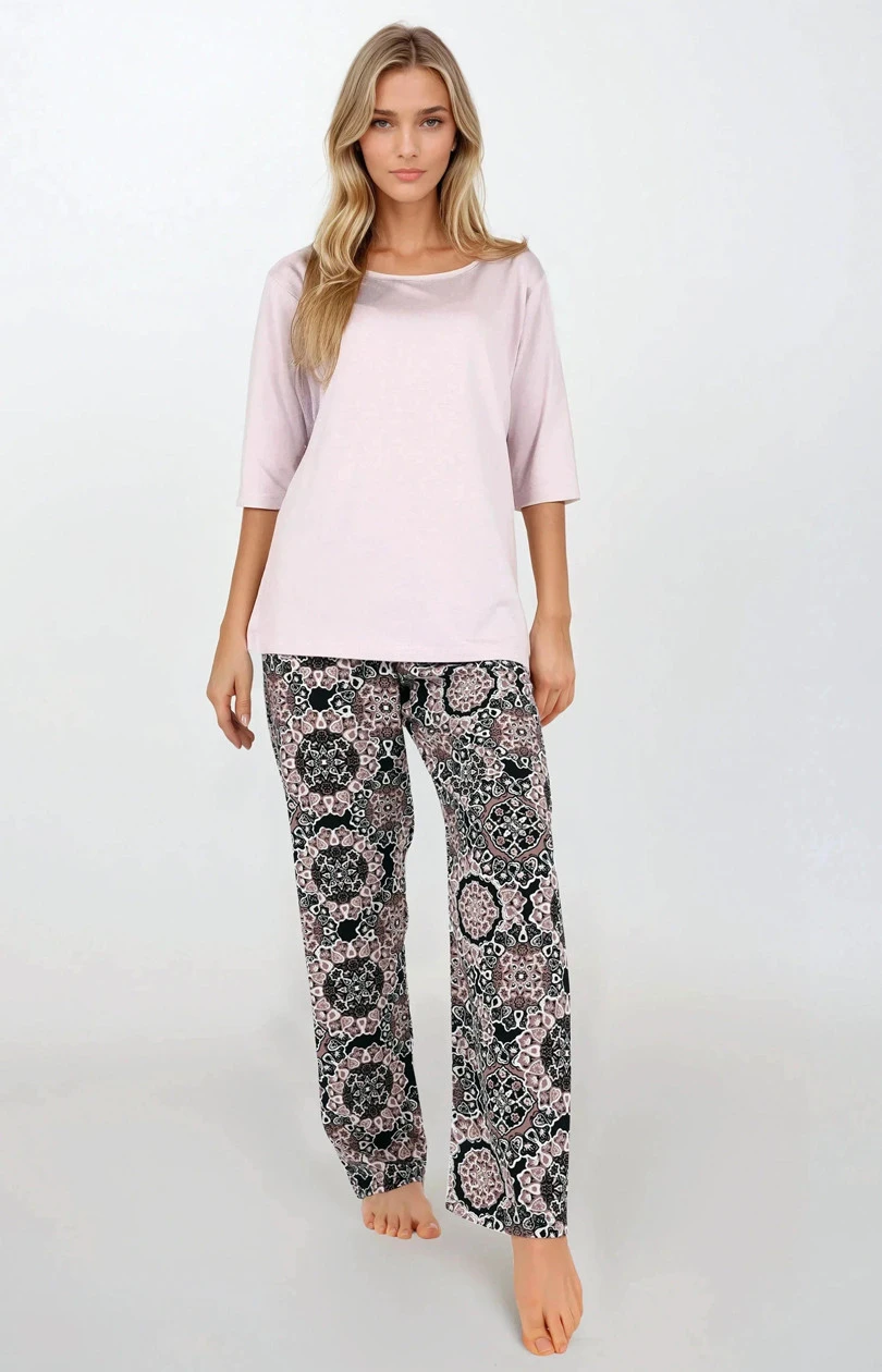 Elegantní a pohodlný ženský pyžamový set ve 2 dílech, navržený pro každodenní relaxaci a ženskou estetiku. Tričko s 3/4 rukávem a kulatým výstřihem vypadá decentně a elegantně, ideální také jako domácí oděv. V jemných barvách podtrhuje přirozenou krásu a ženský styl. Volný, pohodlný střih kalhot s dlouhými nohavicemi a elastickým pasem zajišťuje volnost pohybu a pohodlí během celé noci. Celý kus je vyroben z jemného, příjemného materiálu, který jemně obklopuje tělo. Skvělá volba pro klidné večery a lenivá rána stylově, pohodlně a s elegancí. Obsah: Dno: Viskóza 100% Vrchní část: Elastan 8%, Viskóza 92%