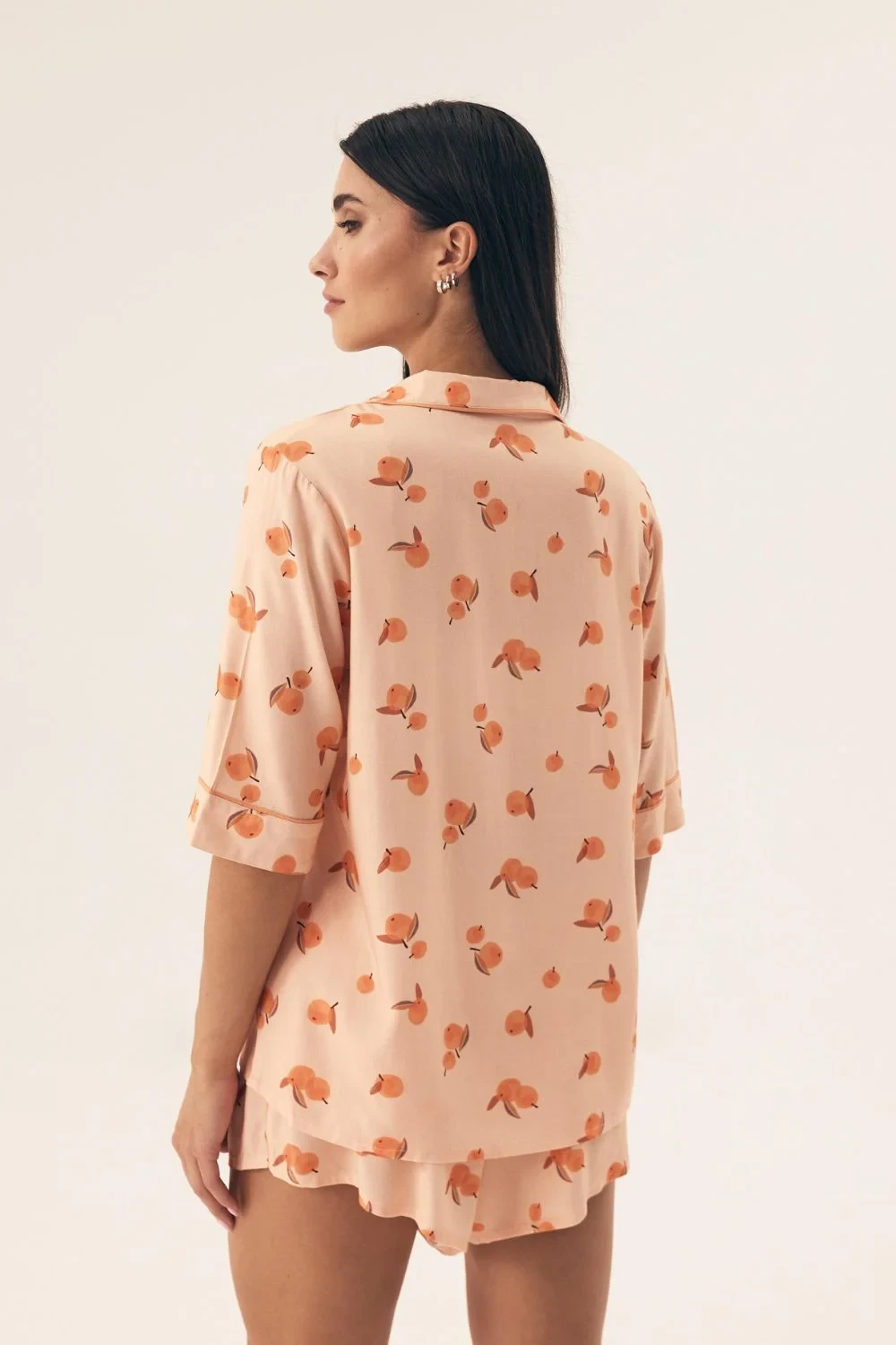 Elegantní dámský pyžamový set s decentními detaily ve formě lemování, který spojuje styl s pohodlím. Košile s krátkým rukávem, zapínání na knoflíky, s límečkem, vytváří klasický a zároveň pohodlný vzhled. Volný střih poskytuje volnost pohybu a materiál s potiskem jí dodává šarmu. Kraťasy bez kapes s širokým elastickým pasem zaručují pohodlí po celou noc. Vyrobeno z prodyšné pleteniny, ideální na teplé noci. Pyžamo je baleno v praktickém fóliovém sáčku, ideální jako dárek.