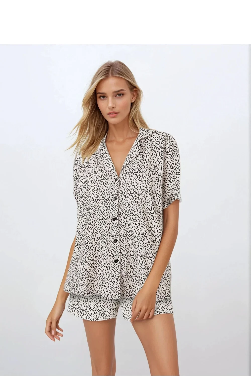 Elegantní dámské pyžamo s klasickým střihem, navržené s ohledem na pohodlí a styl. Dvoudílná sada se skládá z volné košile s krátkým rukávem, zapínání na knoflíky, s výstřihem do špičky a kraťasů s pohodlným elastickým pasem. Jemná, decentní barevnost a elegantní manžety dodávají celku ženský šarm. Pyžamo je ušito z přírodních, hypoalergenních materiálů, které jsou jemné k pokožce a příjemné na dotek, což z něj činí skvělou volbu jak na teplé noci, tak na lenivá rána. Produkt navržený a vyrobený v Polsku, balený v estetickém balení, skvělý nápad na dárek.
