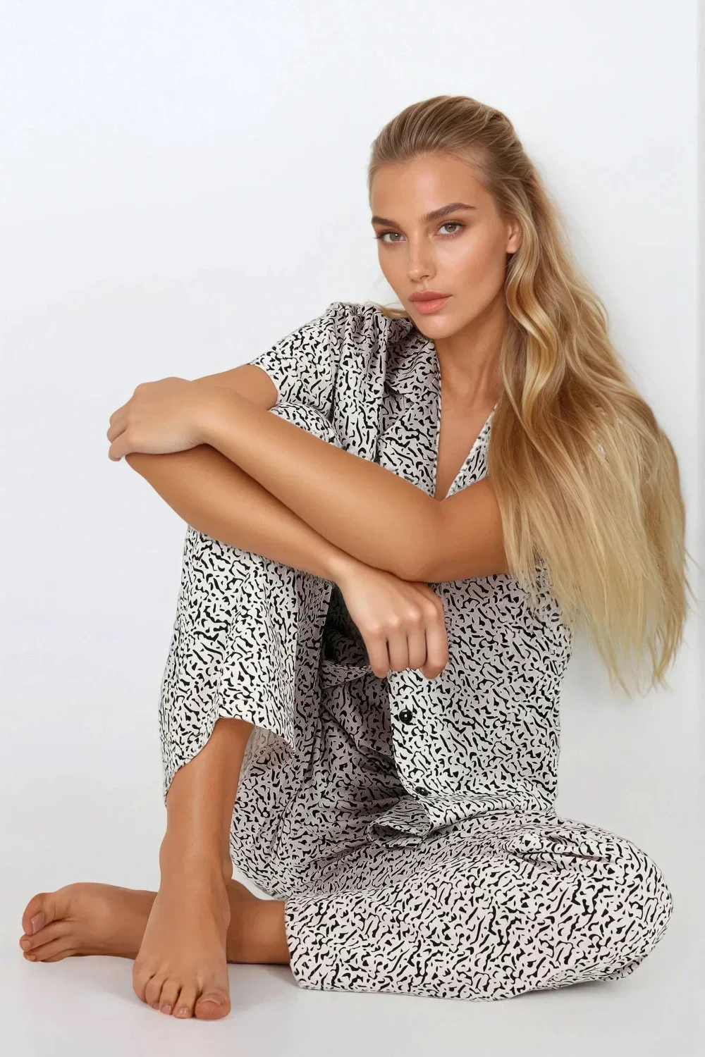 Elegantní a ženská dámská pyžama, která spojuje eleganci s každodenním pohodlím. Dvoudílný set se skládá z košile zapínající se na knoflíky s výstřihem typu V a krátkými rukávy s manžetami a dlouhých kalhot s elastickým pásem. Volný, pohodlný střih dělá pyžamu ideální nejen k spaní, ale také jako stylový oděv pro domácí nošení. Vyrobená z přírodních, jemných materiálů s vysokou kvalitou potisku, je šetrná k pokožce a zajistí maximální pohodlí nošení. Jemná barevná paleta a elegantní styl jí dodávají velmi ženský charakter. Produkt navržen a ušit v Polsku, dodávaný v estetické krabici, ideální i jako dárek.